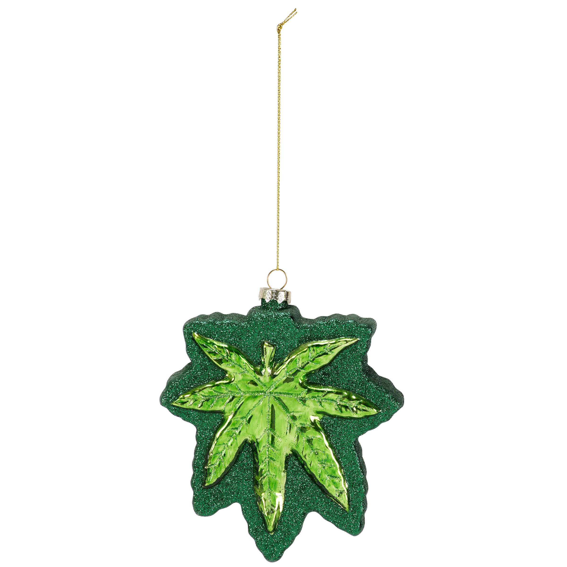 For a modern Christmas greenery option, decorate with our Pot Leaf glass ornament that is perfect for adding personality to a Christmas tree or simply for everyday expression when decorating. This pot leaf shaped ornament features a retro glass ornament style with glitter details that both seasonal and everyday flair. Worry not, this pot leaf ornament is ready to hang using the included top loop and string hanger. A pot-themed home accent designed to maximize chill at home or for gifting to pass that feeling to someone who needs it.
