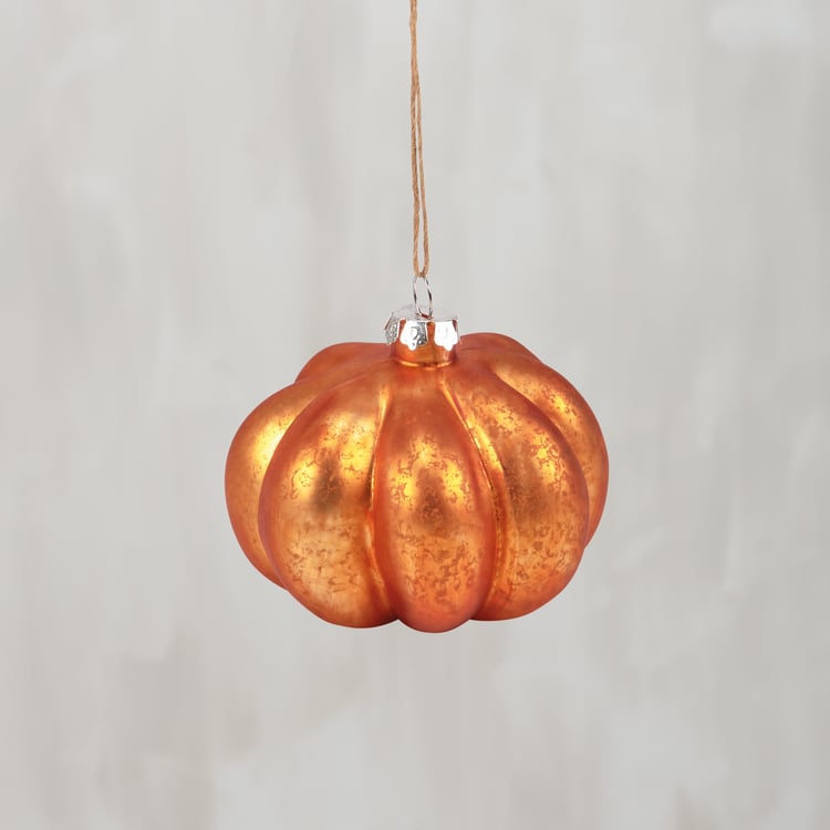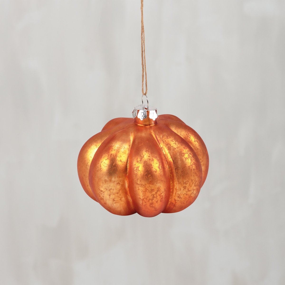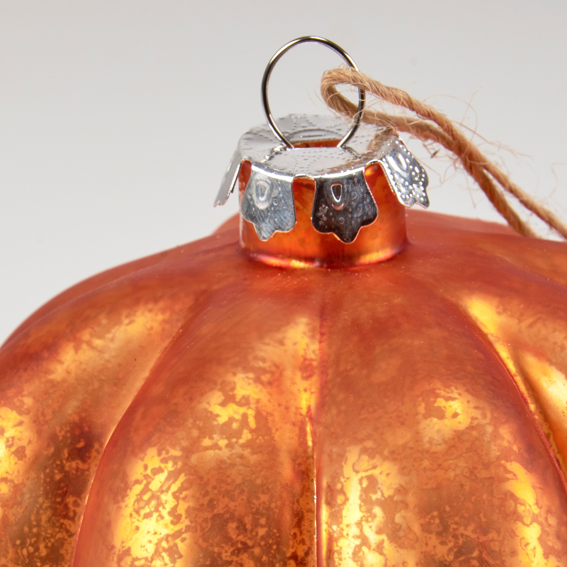 A glass ornament from our Halloween Collection displaying a design of an orange pumpkin with distressed accents. Our glass Pumpkin ornament is ready to hang via the included top loop. A vintage home accent perfect for seasonal display.