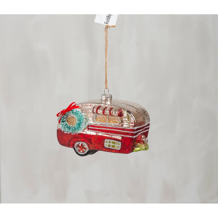 A glass red camper ornament for Christmas featuring glitter details. Contains top loop for easy hanging.