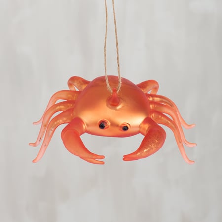 A glass ornament from our Beach Collection displaying a sculpted crab design in a red color with vintage details. Our glass Red Crab ornament is ready to hang for display via the included top loop and string hanger. A vintage style gift perfect for adding personality to a Christmas tree or for everyday beach themed displays.
