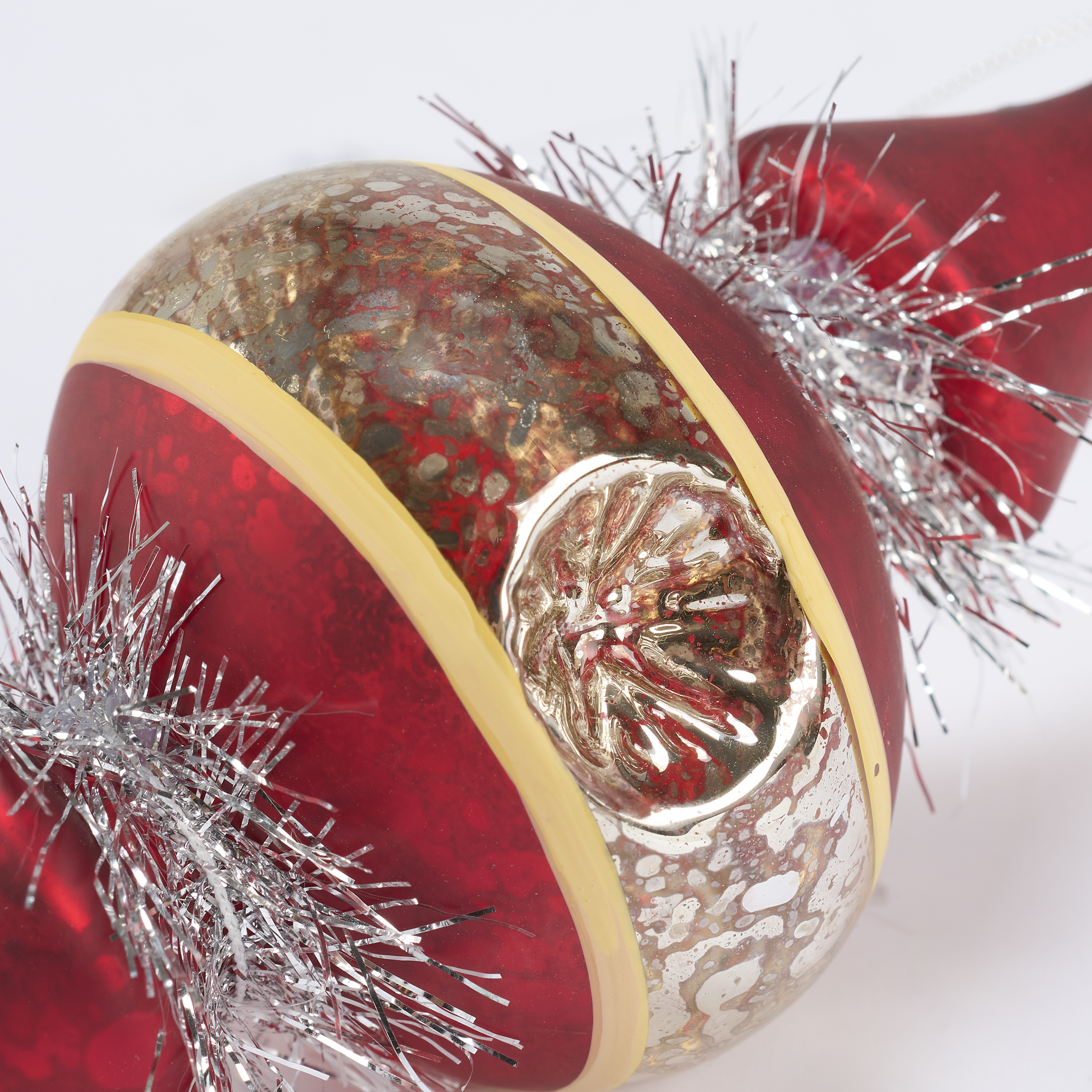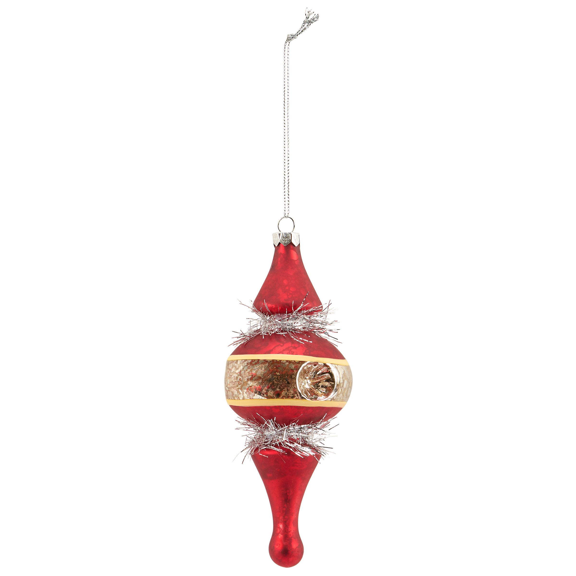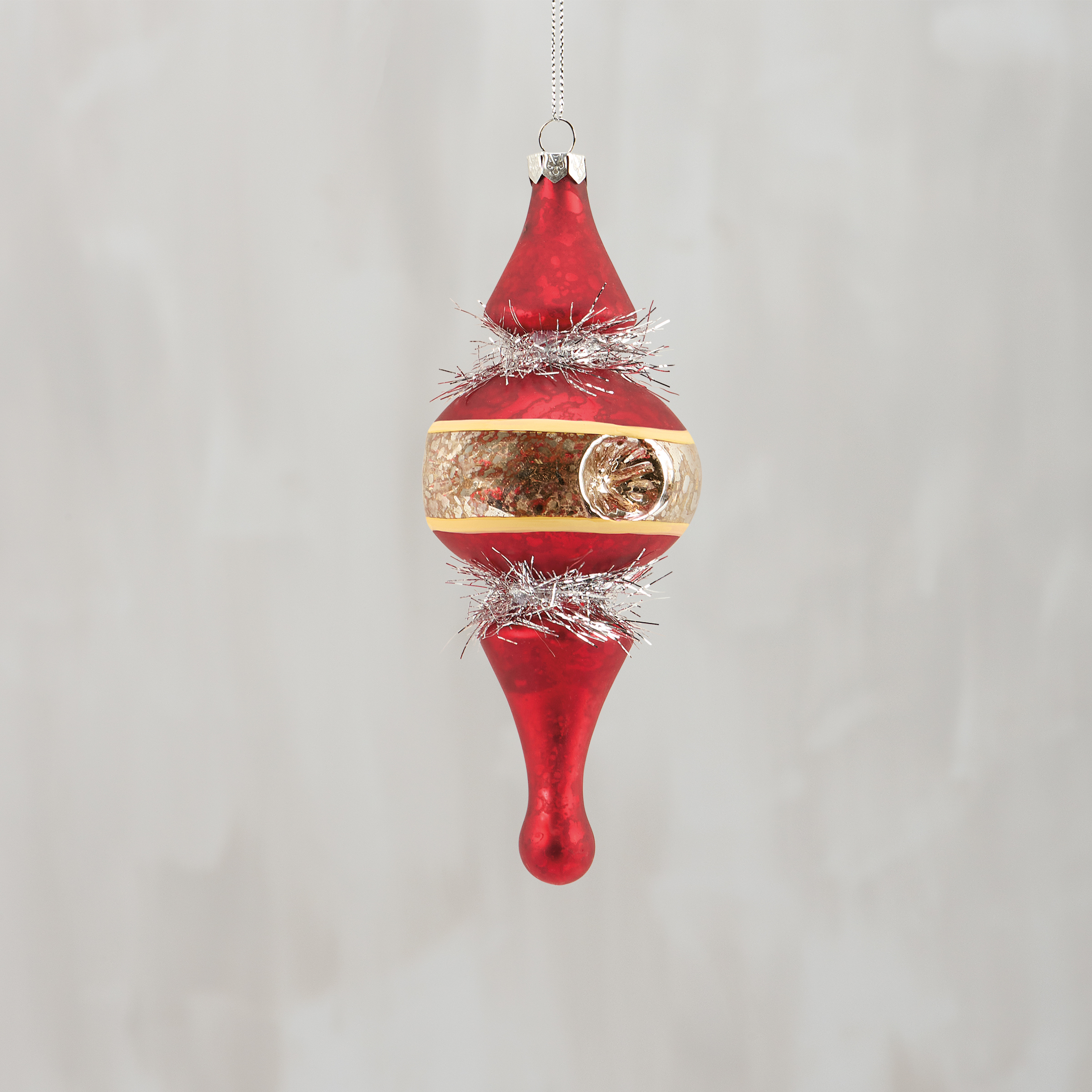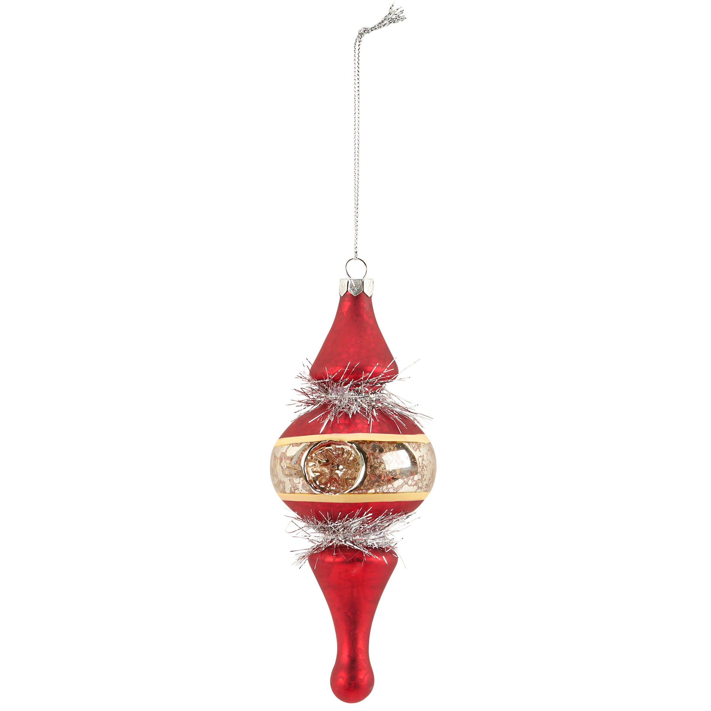A glass ornament from our Christmas Collection displaying a vintage pendant blub design in a red color palette with painted details and tinsel accents. Our glass Red Pendant ornament is ready to hang for display via the included top loop. A vintage seasonal home accent perfect for a Christmas tree or for gifting.