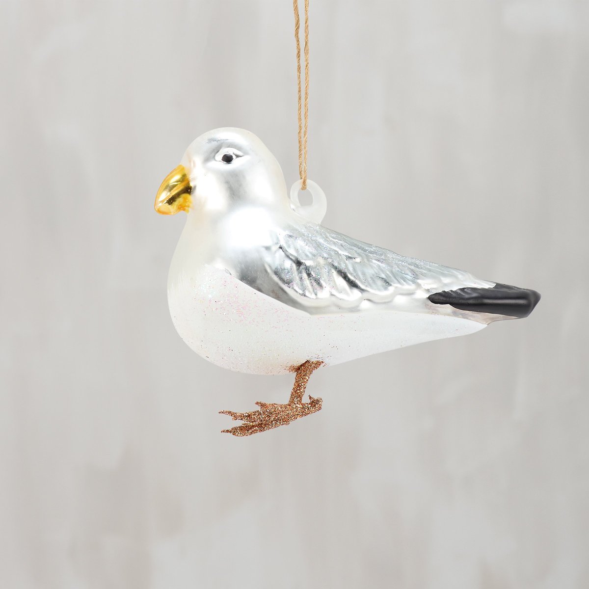 A glass ornament from our Beach Collection displaying a beach inspired design of a seagull with glitter accents and painted details. Our glass Seagull ornament is ready to hang for display via the included top loop. A vintage style gift perfect for adding personality to a Christmas tree or for everyday beach-themed displays.