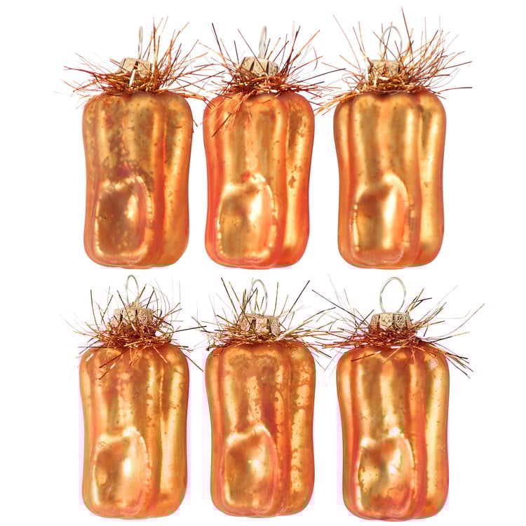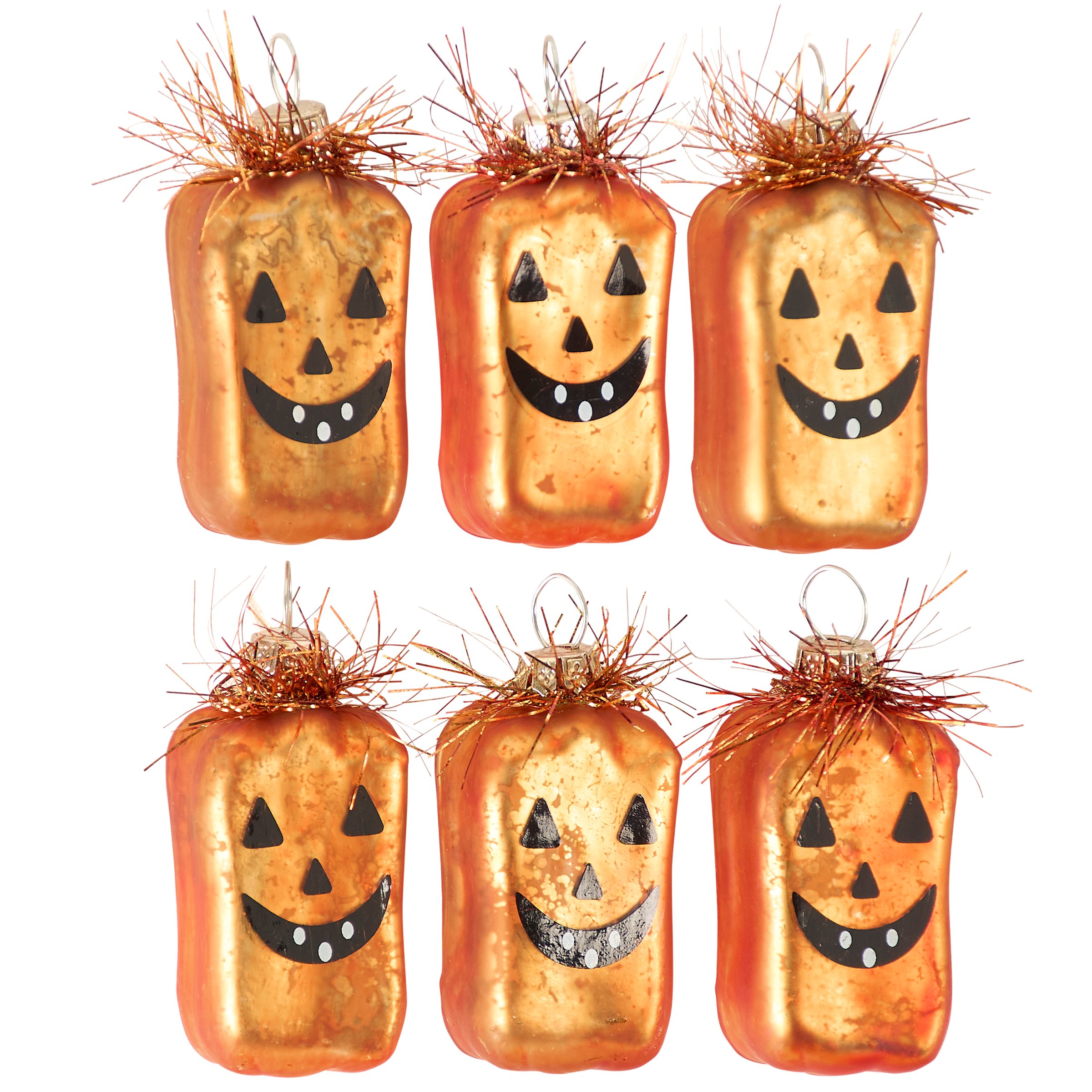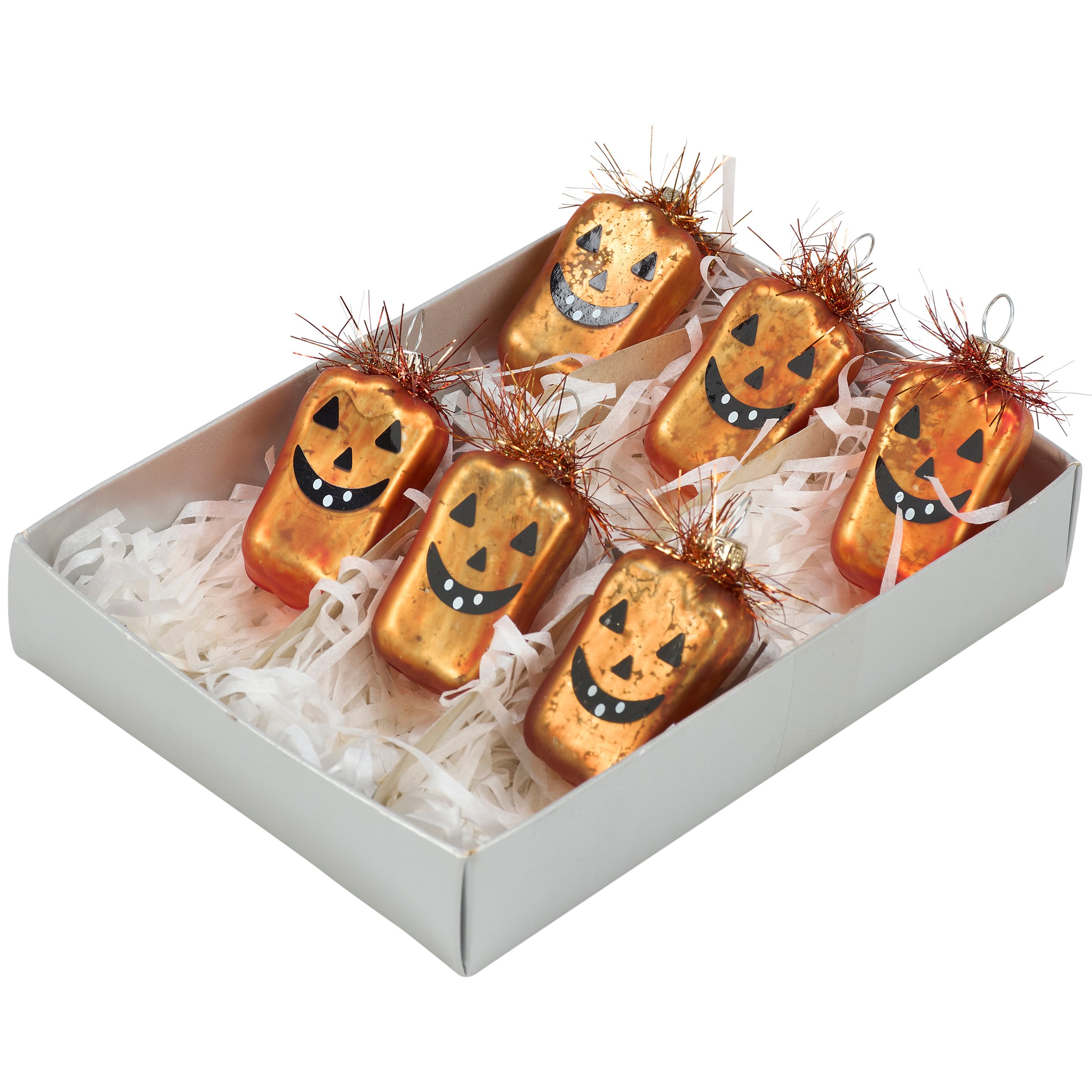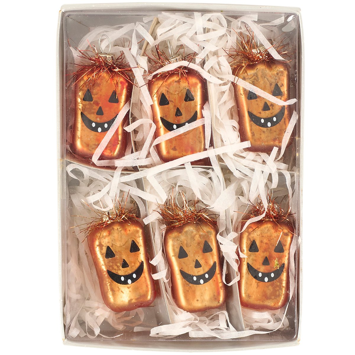 A set of glass ornaments displaying vintage jack o'lantern designs with painted details and tinsel accents that coordinate well with décor from our Halloween Collection. Set includes 6 identical jack o'lantern ornaments ready to hang via attached top loops. Our glass Jack O'Lantern ornament set is packaged together in a paper box with acrylic window to easily view ornaments for store display. A set of vintage Halloween home accents perfect for seasonal display.