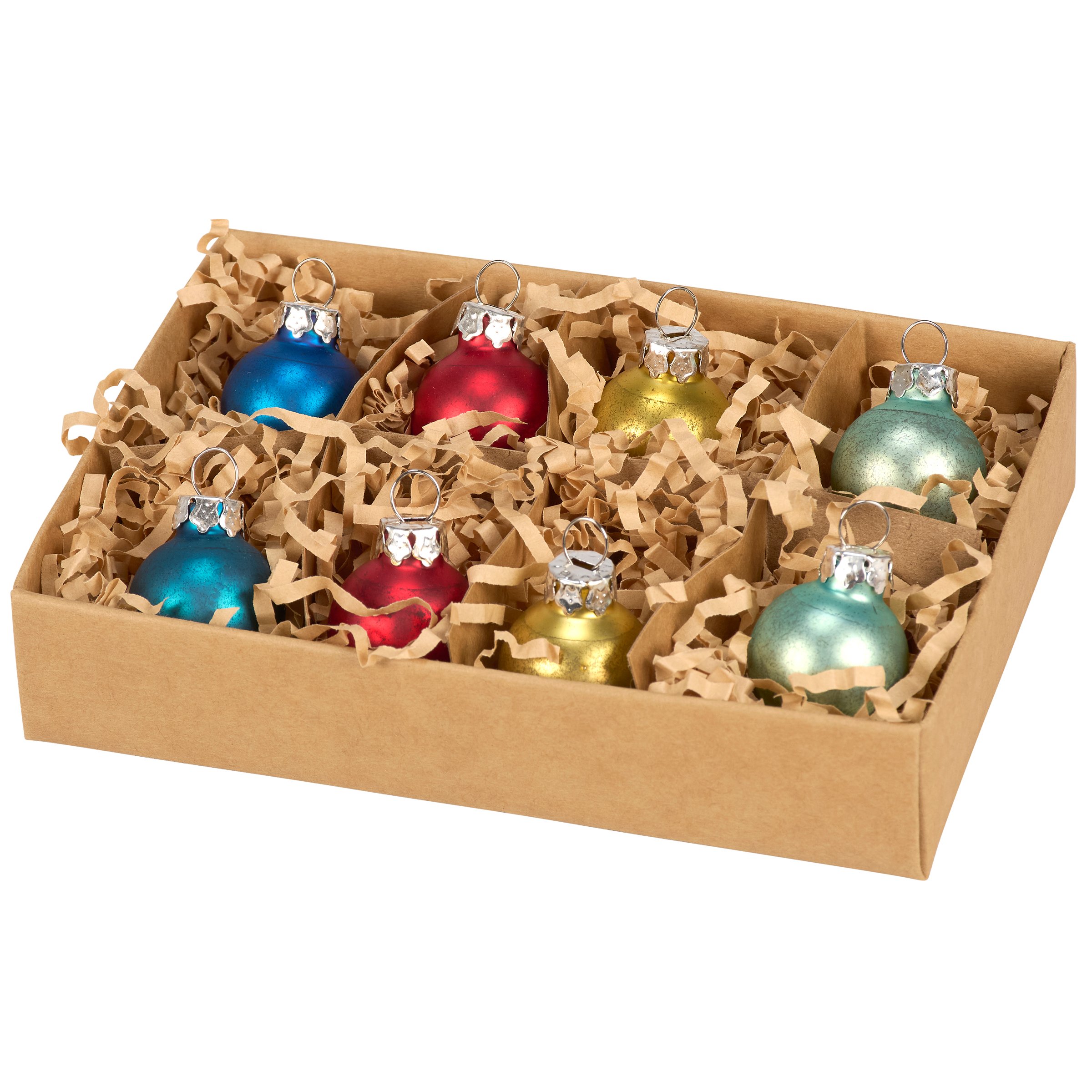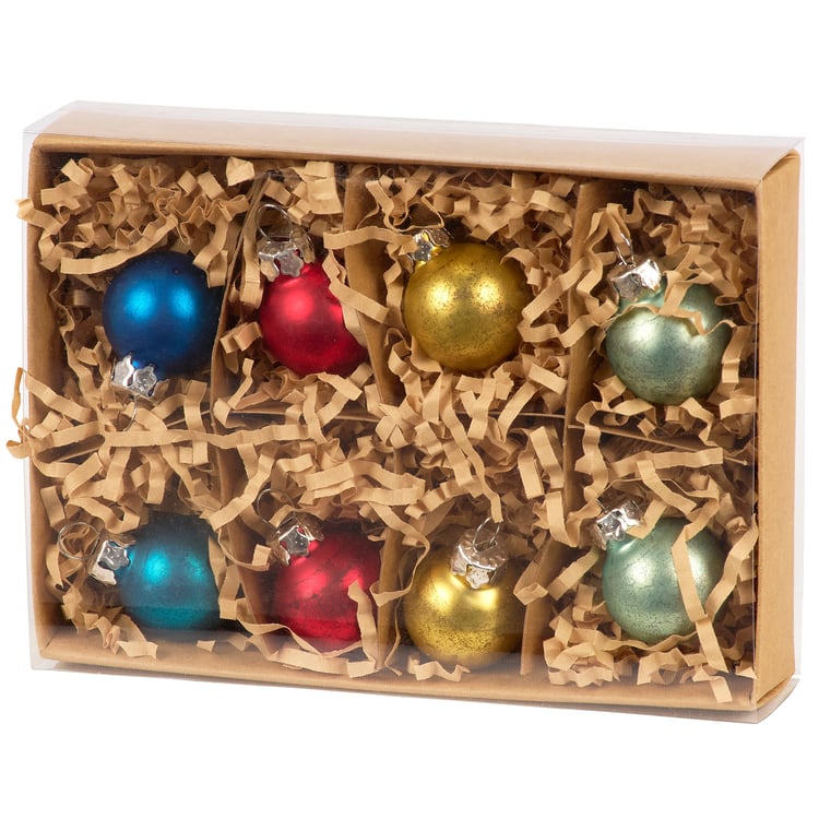 A set of glass ornaments from our Christmas Collection displaying a colorful holiday color palette. Set includes 8 multi-color ornaments with distressed details. Our Multi Color Balls glass ornament set is ready to hang via the included top hangers. Packaged in a cardboard box with acrylic sleeve to easily view ornaments. A set of retro Christmas ornaments perfect for a Christmas tree or for gifting.