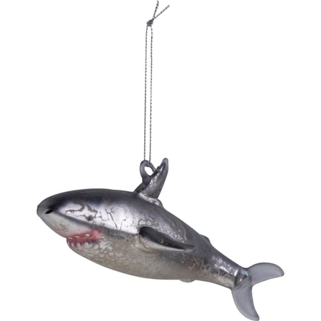 A glass ornament featuring a shark shape with a string loop for easy hanging.
