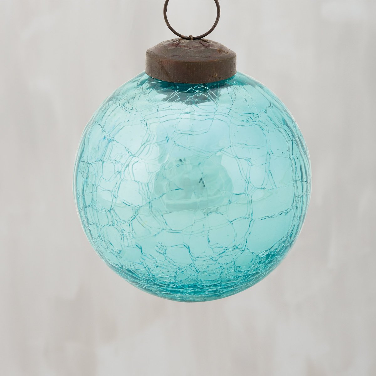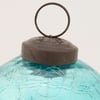 A small glass ornament from our Christmas Collection displaying a vintage Christmas ball design with a retro pastel blue color and distressed details. Our small glass Blue Ball ornament is ready to hang for display via the included top loop. A retro pastel seasonal home accent perfect for a Christmas tree or for gifting.