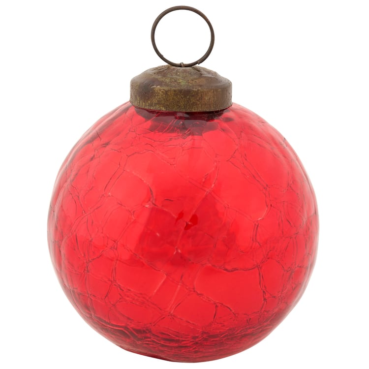 A small glass ornament from our Christmas Collection displaying a vintage Christmas ball design with a holiday red color and distressed details. Our small glass Red Ball ornament is ready to hang for display via the included top loop. A vintage seasonal home accent perfect for a Christmas tree or for gifting.