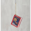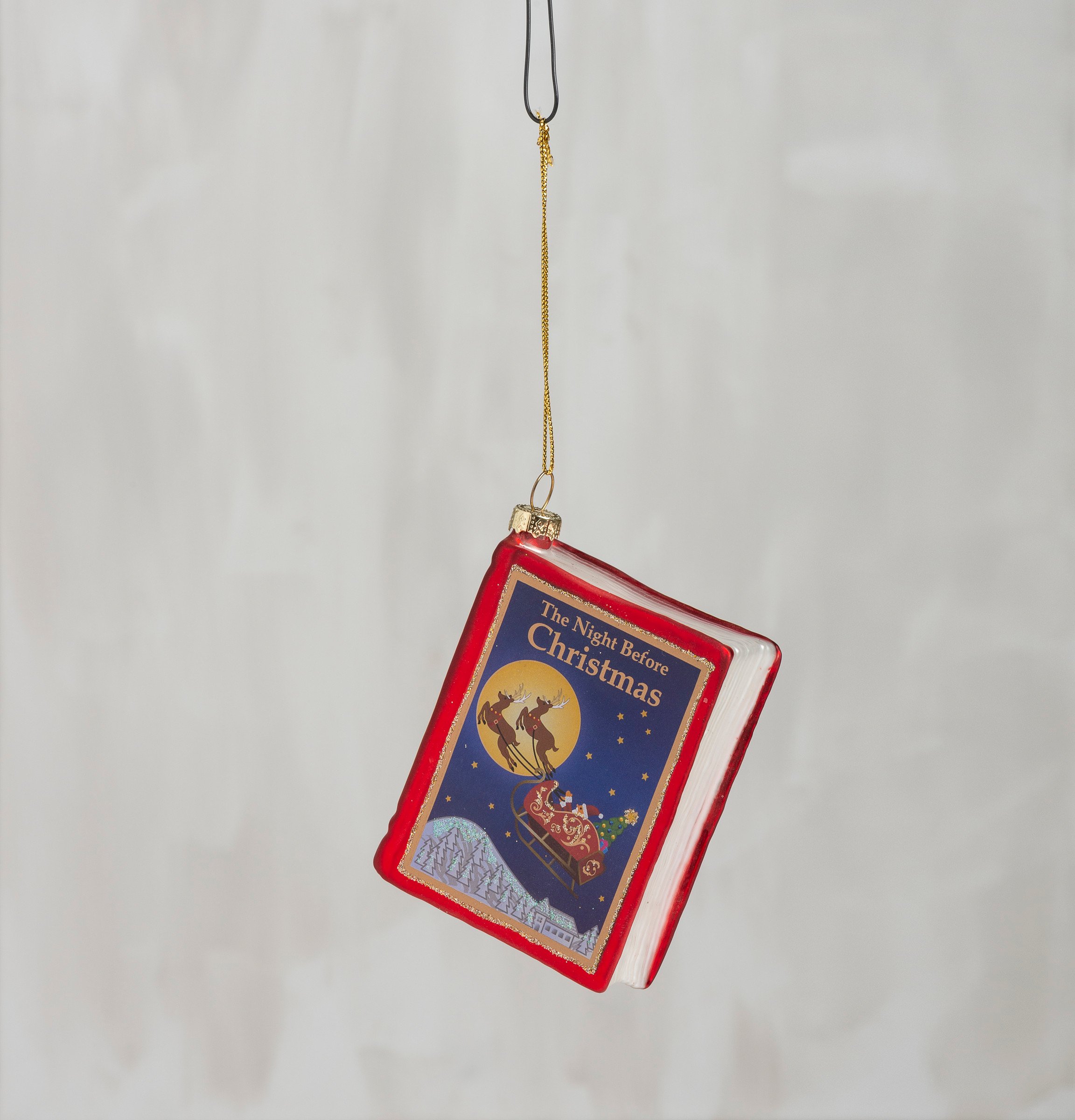 A glass storybook ornament for Christmas featuring glitter details. Contains top loop for easy hanging.