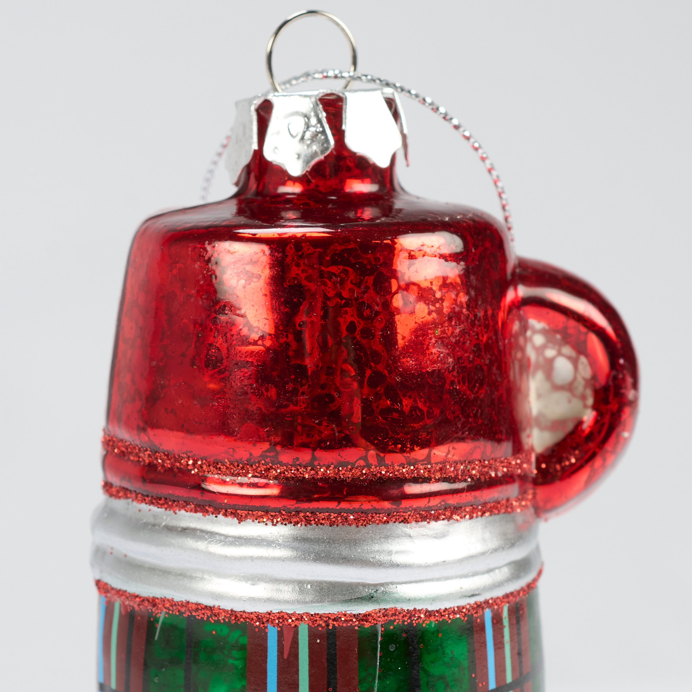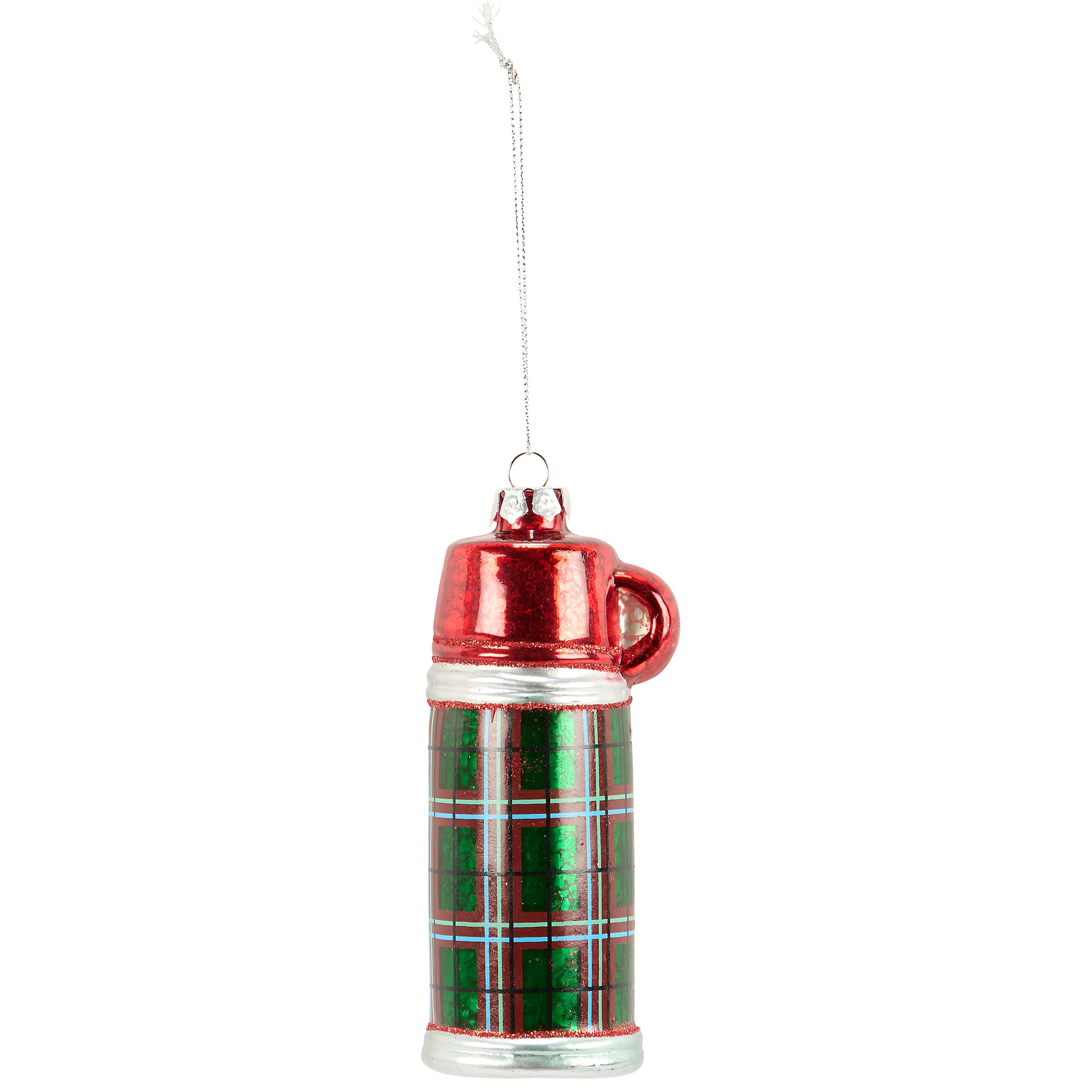 A glass ornament from our Christmas Collection displaying a fun plaid thermos design with painted details and glitter accents. Our glass Thermos ornament is ready to hang for display via the included top loop. A fun camping-themed gift perfect for adding personality to a Christmas tree.