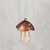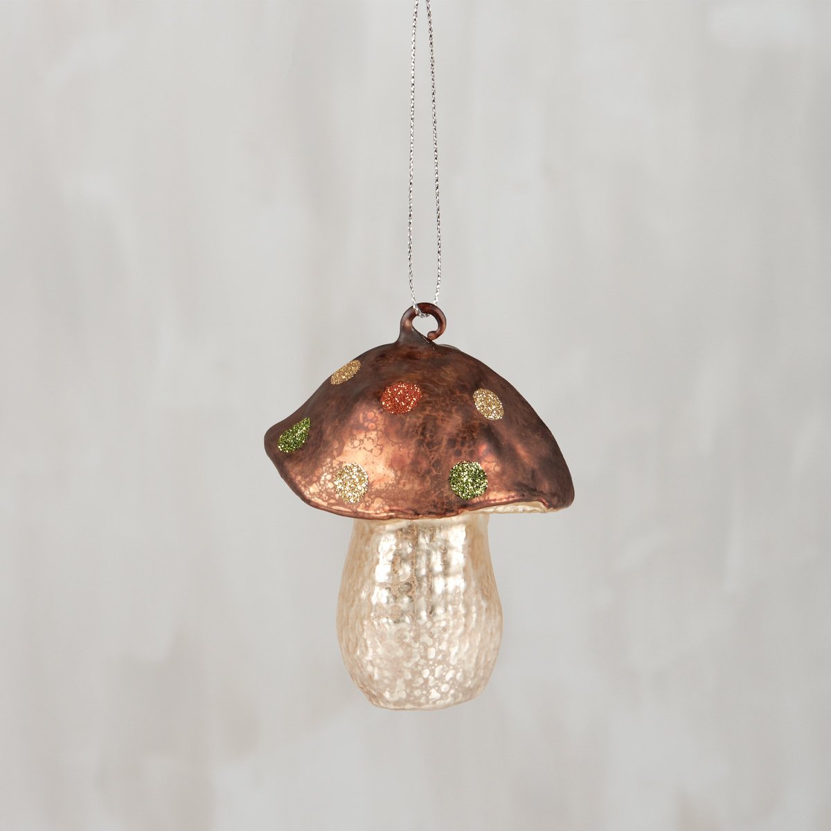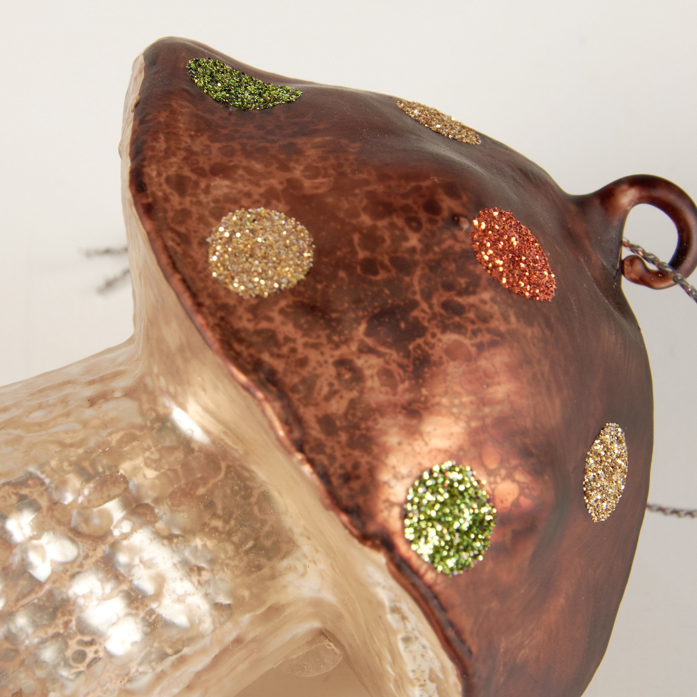A glass ornament from our Christmas Collection displaying a design of a brown toadstool mushroom with color glitter accents. Our Toadstool glass ornament is ready to hang via the included top loop. A nature-themed seasonal home accent perfect for a Christmas tree or for gifting.