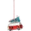 A glass ornament from our Christmas Collection displaying a design of a vintage bus with glitter accents. Design also features a faux tree on top of camper with snowy details. Our glass Vintage Bus ornament is ready to hang via the included red and white rope hanger. A fun seasonal home accent perfect for a Christmas tree or for gifting.