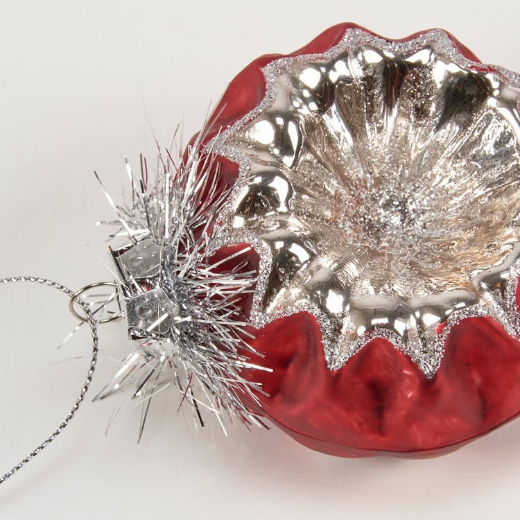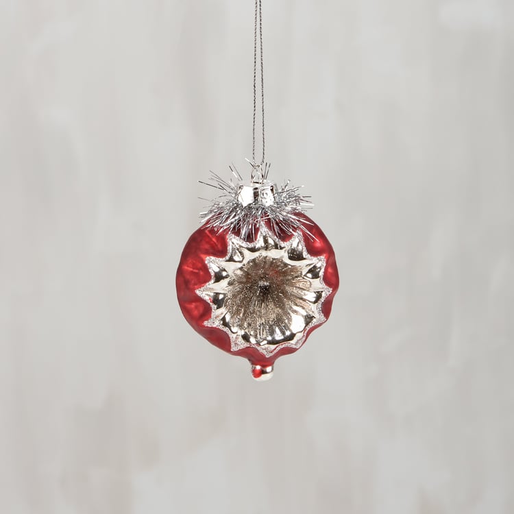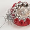 A glass ornament from our Christmas Collection displaying a vintage red bulb design resembling a rose with glitter and tinsel accents. Our glass Vintage Rose ornament is ready to hang via the top loop and string. A vintage seasonal home accent perfect for a Christmas tree or for gifting.