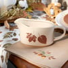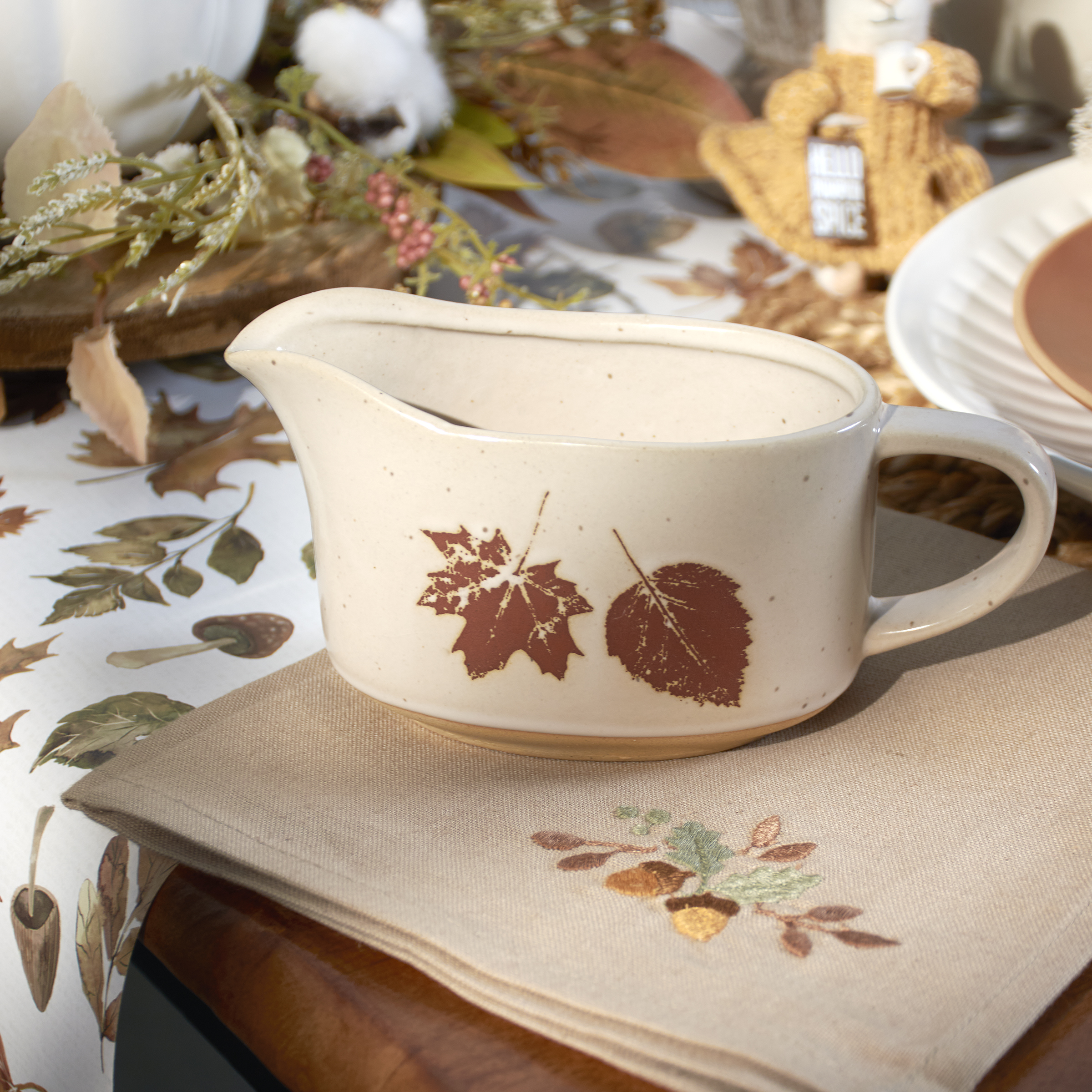 A durable stoneware gravy boat from our Fall & Harvest Collection displaying a cream color with debossed leaf designs in brown on both sides and bare ceramic detail on the base. Our Fall Leaves gravy boat is microwave, dishwasher, and food safe for convenient use. A piece of rustic tableware perfect for seasonal gatherings.