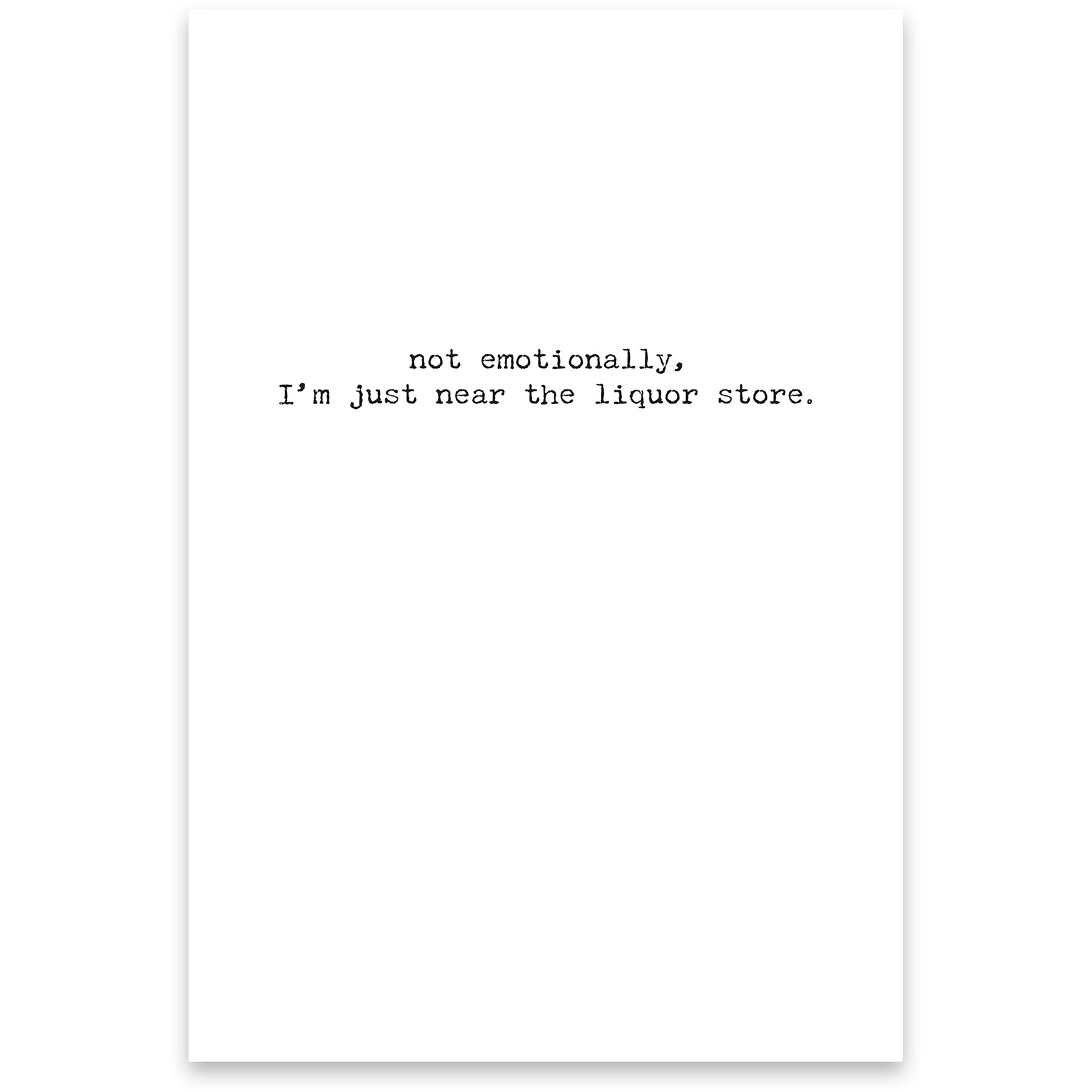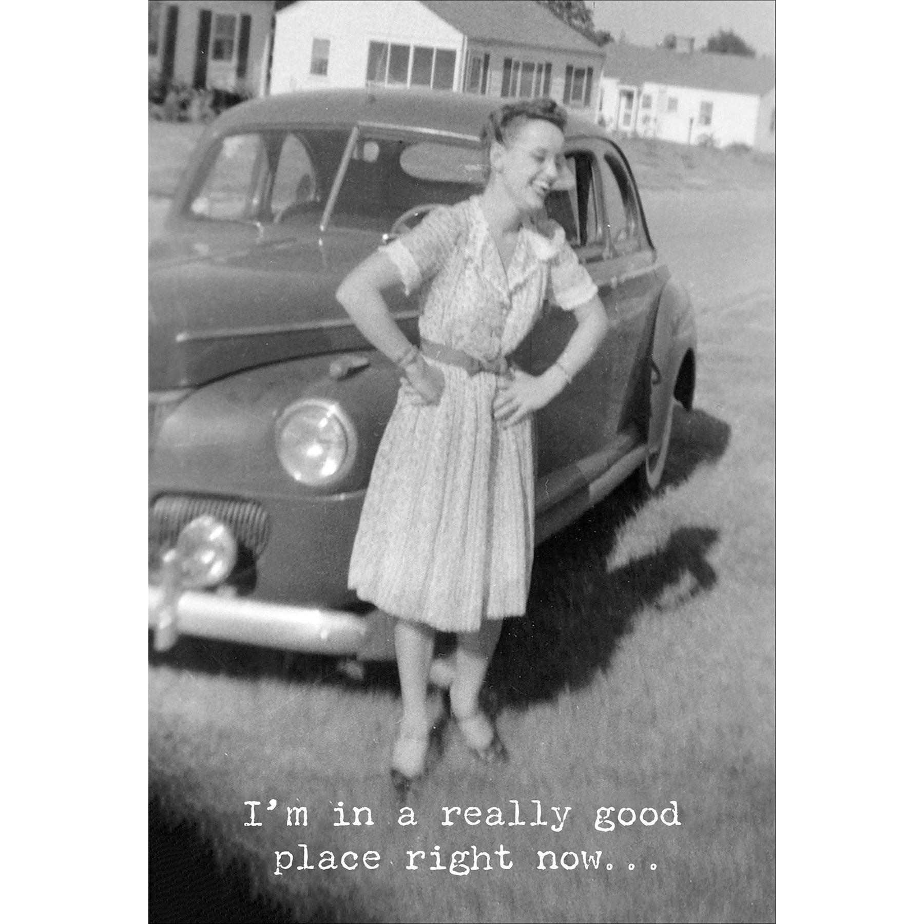 A humorous greeting card from our Trash Talk By Annie Collection displaying a vintage photograph with complementing sentiments. Card features "I'm In A Really Good Place Right Now..." sentiment on the outside and "Not Emotionally. I'm Just Near The Liquor Store." sentiment on the inside with space to add a personalized message. Our A Really Good Place greeting card is a hilarious gifting option for everyday moments. Proudly made in the USA.