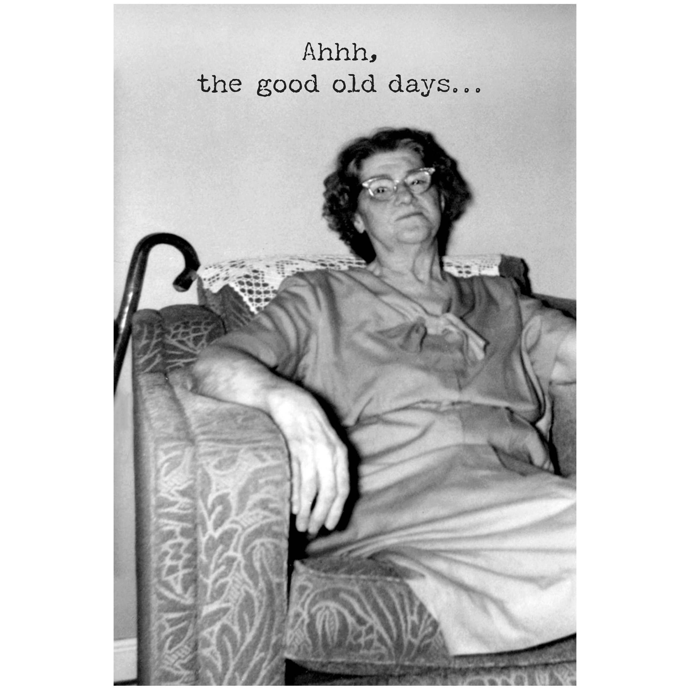 A greeting card from our Trash Talk By Annie Collection displaying a vintage black and white photograph complemented with a sassy age themed sentiment. Sassy greeting card features "Ahhh, The Good Old Days..." sentiment on the outside and "When A New Hip Joint Meant A Cool Place To Go." sentiment on the inside with space to add a personalized message. Our Ahhh The Good Old Days greeting card is a hilarious gift for birthdays or everyday moments. Proudly made in the USA.