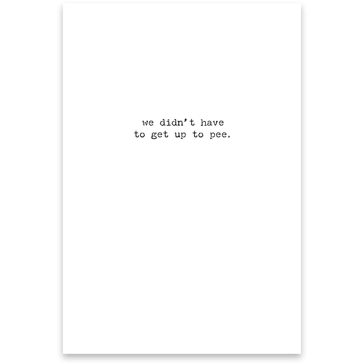 A humorous greeting card from our Trash Talk By Annie Collection displaying a vintage photograph with complementing sentiments. Card features "At Our Age, An 'All Nighter' means…" sentiment on the outside and "We Didn't Have To Get Up To Pee." sentiment on the inside with space to add a personalized message. Our All Nighter Means greeting card is a hilarious gifting option for everyday moments. Proudly made in the USA.