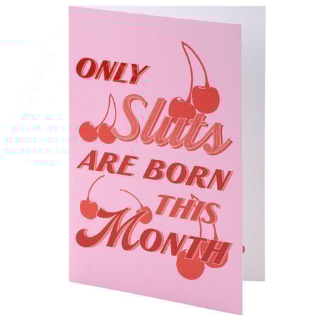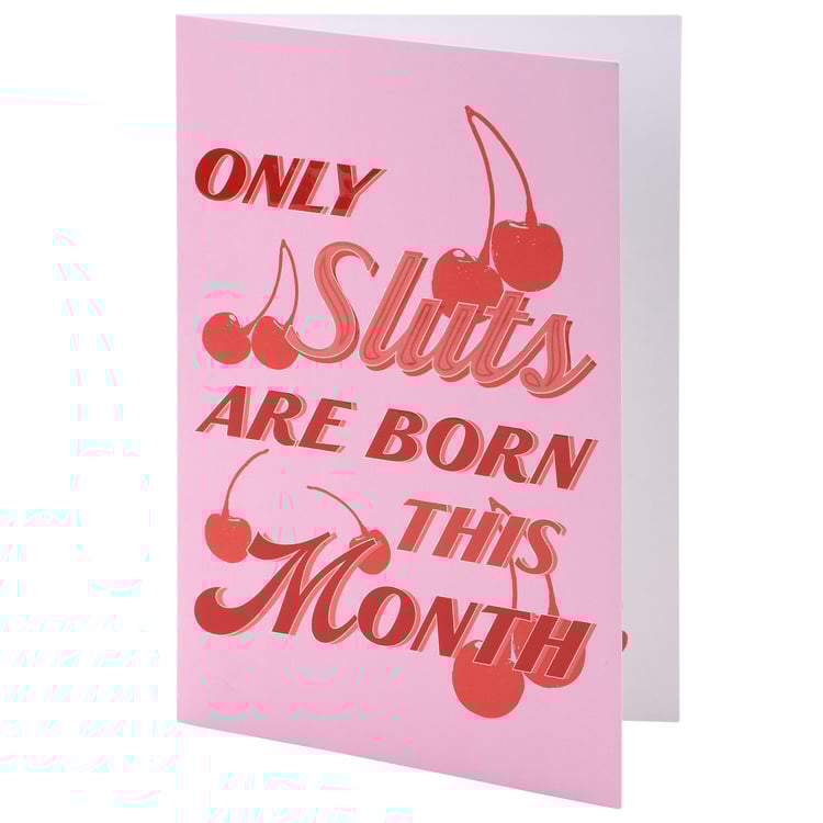 This funny birthday card features a retro cherry inspired design with a sassy birthday sentiment. Sassy birthday sentiment reads "Only Sluts Are Born This Month" on the front and "Happy Birthday" on the inside with space to add a personalized message. Questionables greeting cards include a kraft paper envelope for a premium finishing touch. Our Born This Month birthday card offers a more relatable way to wish like-minded friends and family a happy birthday. Proudly made in the USA.
