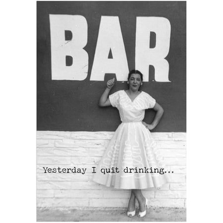 A humorous greeting card from our Trash Talk By Annie Collection displaying a vintage photograph of a woman under a bar sign with complementing sentiment. Card features "Yesterday I Quit Drinking..." sentiment on the outside and "But Tonight We Celebrate My Comeback." sentiment on the inside with space to add a personalized message. Our Celebrate My Comeback greeting card is a hilarious gifting option for everyday moments. Proudly made in the USA.