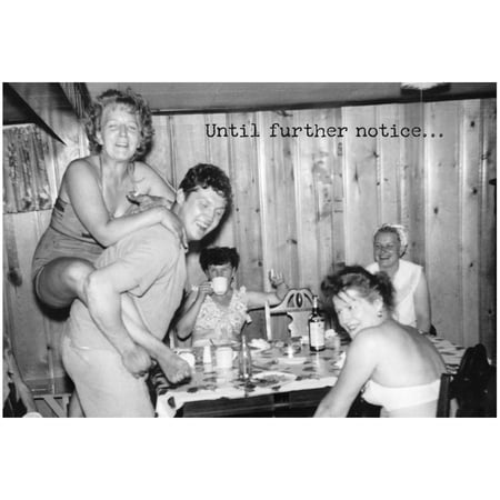 A greeting card from our Trash Talk By Annie Collection displaying a vintage black and white photograph complemented with a humorous celebratory sentiment. Greeting card features "Until Further Notice..." sentiment on the outside and "Celebrate Everything!" sentiment on the inside with space to add a personalized message. Our Celebrate greeting card is a hilarious gifting option for everyday moments. Proudly made in the USA.