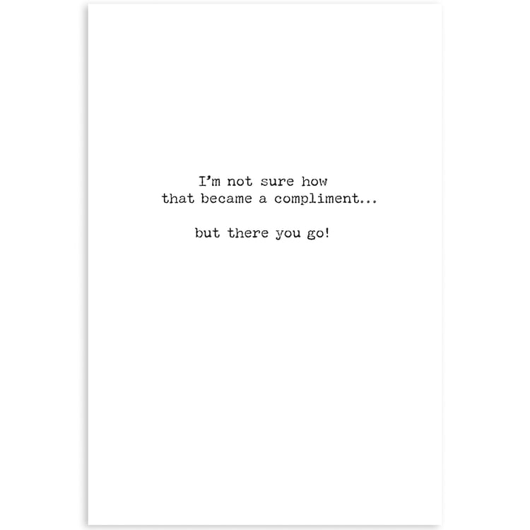 A greeting card from our Trash Talk By Annie Collection displaying a vintage black and white photograph complemented with a humorous sentiment. Greeting card features "You're The Shit!" sentiment on the outside and "I'm Not Sure How That Became A Compliment... But There You Go!" sentiment on the inside with space to add a personalized message. Our Compliment greeting card is a hilarious gifting option for everyday moments. Proudly made in the USA.