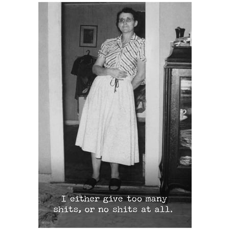 A greeting card from our Trash Talk By Annie Collection displaying a vintage black and white photograph complemented with a humorous sentiment. Greeting card features "I Either Give Too Many Shits, Or No Shits At All." sentiment on the outside and "I Can't Seem To Find A Middle Ground For Moderate Shit Distribution." sentiment on the inside with space to add a personalized message. Our Distribution greeting card is a hilarious gifting option for everyday moments. Proudly made in the USA.