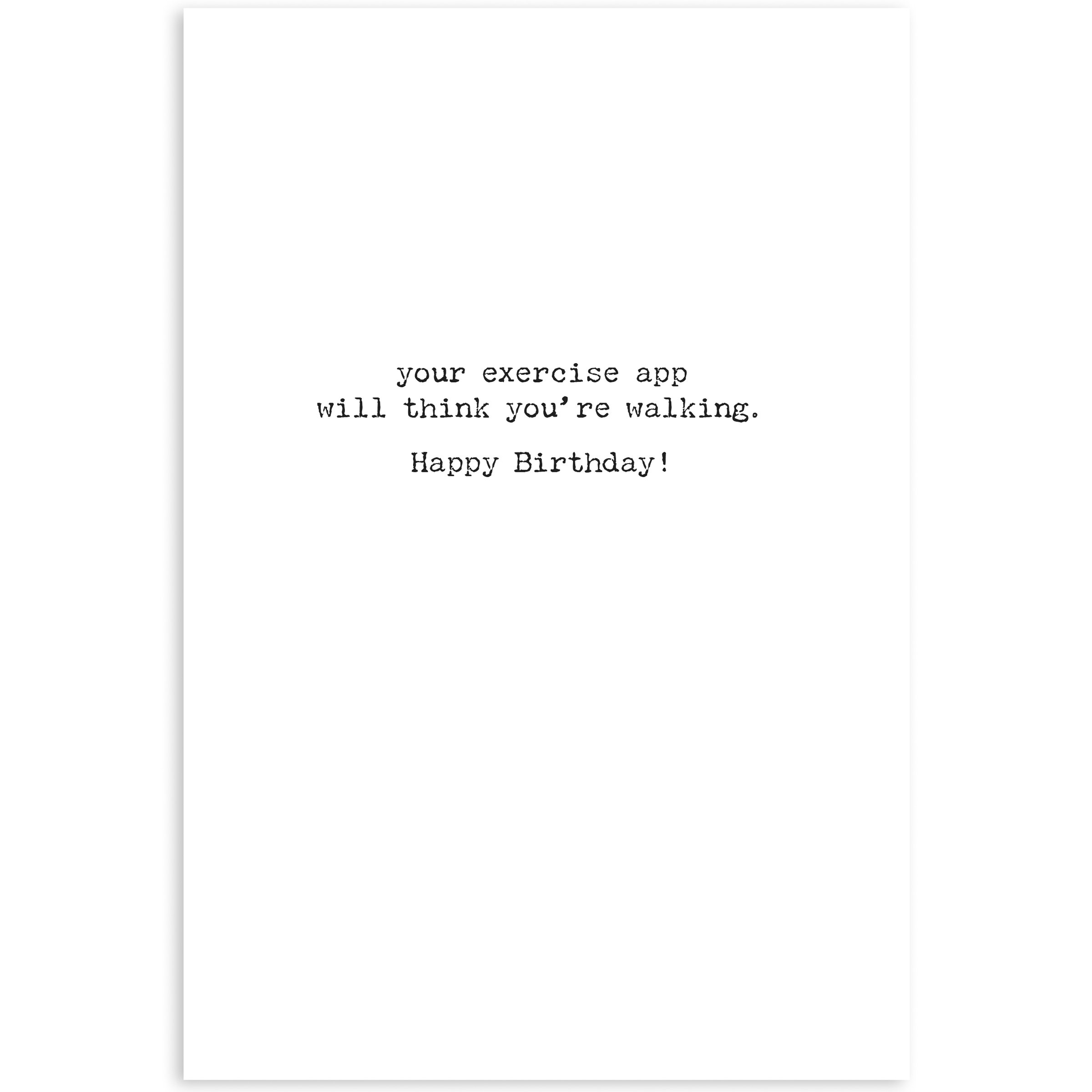A greeting card from our Trash Talk By Annie Collection displaying a fun vintage black and white photograph complemented with a humorous birthday inspired sentiment. Greeting card features "If You Eat Cake Fast Enough..." sentiment on the outside and "Your Exercise App Will Think You're Walking. Happy Birthday!" sentiment on the inside with space to add a personalized message. Our Eat Cake greeting card is a hilarious gifting option for birthdays. Proudly made in the USA.