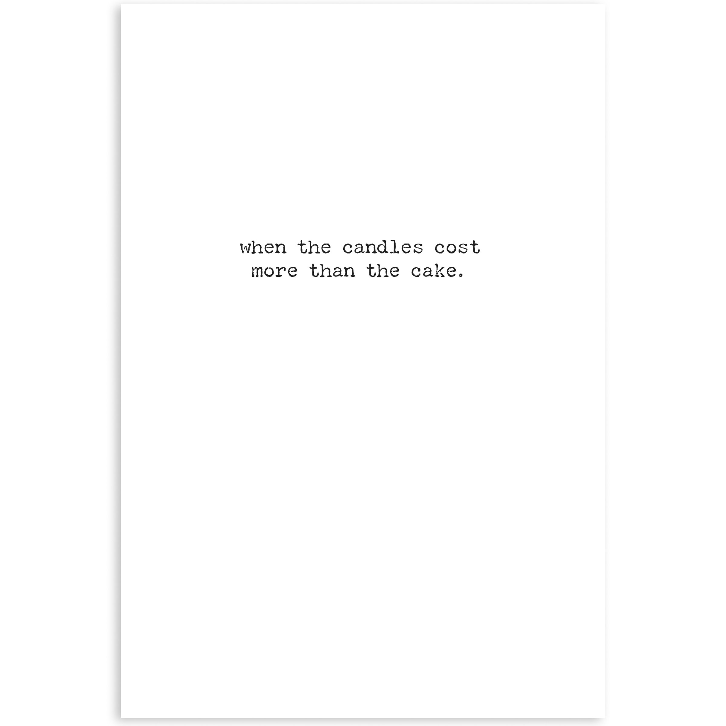 A greeting card from our Trash Talk By Annie Collection displaying a vintage black and white photograph complemented with a humorous age inspired sentiment. Greeting card features "You Know You're Getting Old..." sentiment on the outside and "When The Candles Cost More Than The Cake." sentiment on the inside with space to add a personalized message. Our black and white Getting Old greeting card is a hilarious gifting option for birthdays or everyday moments. Proudly made in the USA.
