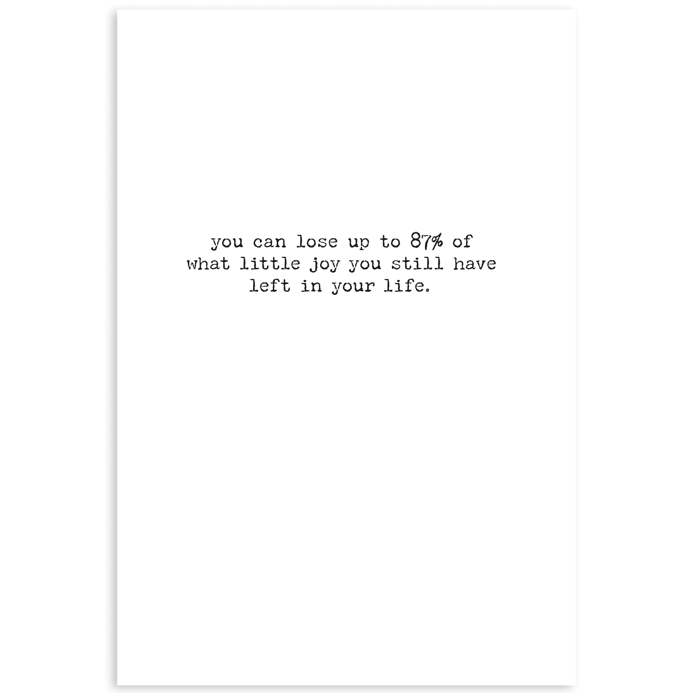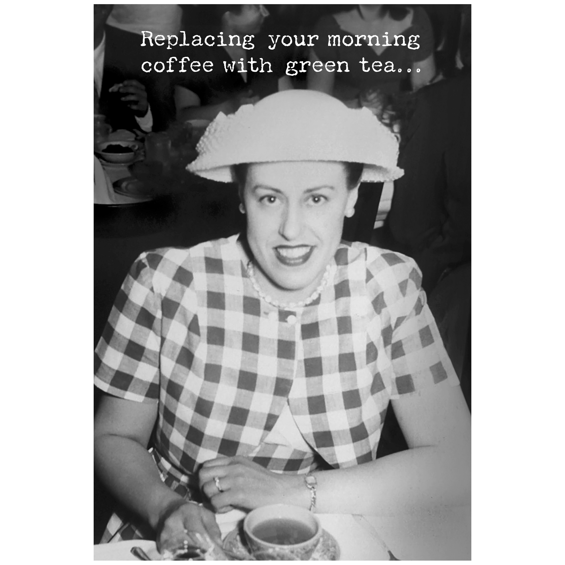 A greeting card from our Trash Talk By Annie Collection displaying a fun vintage black and white photograph complemented with a humorous coffee inspired sentiment. Greeting card features "Replacing Your Morning Coffee With Green Tea..." sentiment on the outside and "You Can Lose Up To 87% Of What Little Joy You Still Have Left In Your Life." sentiment on the inside with space to add a personalized message. Our Green Tea greeting card is a hilarious gifting option for everyday moments. Proudly made in the USA.