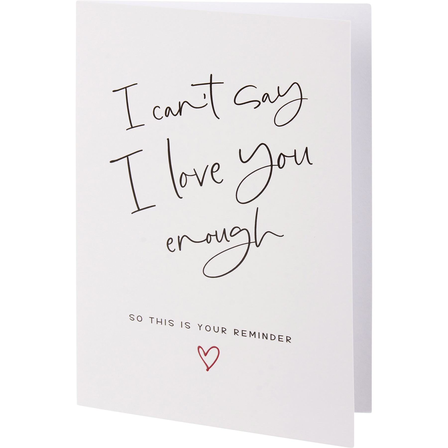An elegant greeting card from our Greeting Card Collection displaying a loving sentiment and a digitally embossed heart design that creates a detailed texture you can feel. The front of the card features "I Can't Say I Love You Enough - So This Is Your Reminder" sentiment with a blank space inside to create a personalized message. Each card includes a brown kraft paper envelope for the perfect finishing touch. I Love You greeting card is proudly made in the USA.