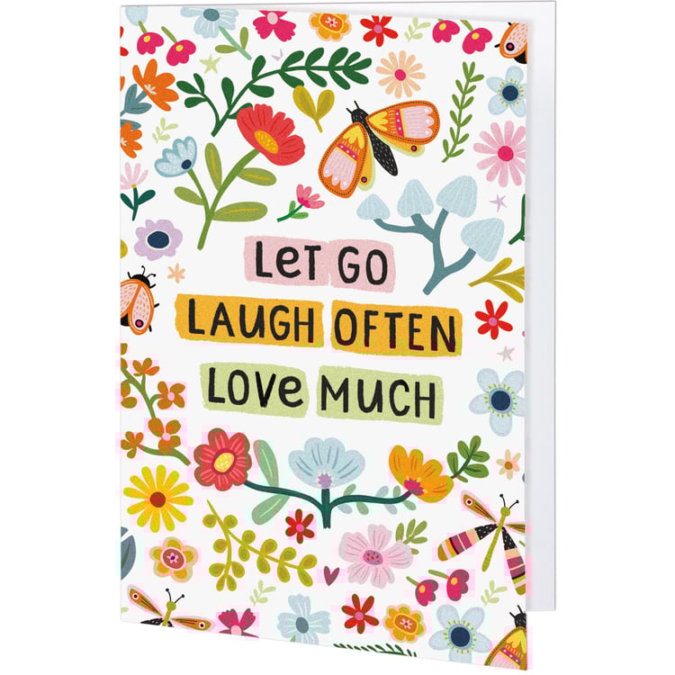 A greeting card from our Greeting Card Collection displaying colorful hand illustrated designs of insects and flowers surrounding an inspirational sentiment that reads "Let Go - Laugh Often - Love Much." Our Laugh Often greeting card features digitally embossed accents that add texture to the design with blank space inside to create a personalized message. Each greeting card includes a brown kraft paper envelope for the perfect finishing touch. An inspirational greeting card great for gifting in everyday moments. Proudly made in the USA.