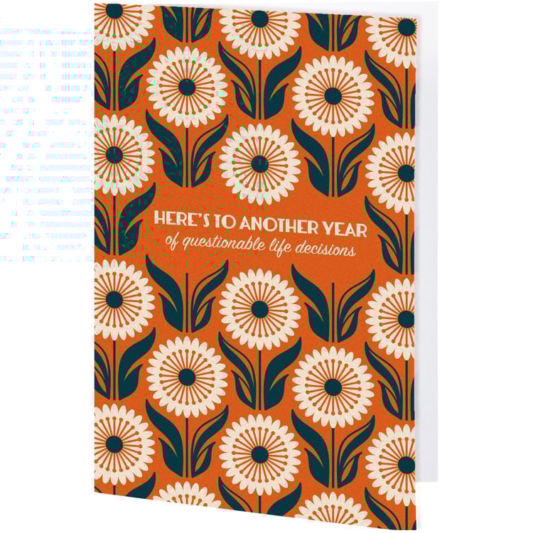 This sassy greeting card displays "Here's To Another Year Of Questionable Life Decisions" with a coordinating stylish floral pattern in a bold color palette. For when a customer is looking for a more relatable way to say happy birthday, this greeting card is perfect for presenting a personal birthday message using the blank space inside. Questionables greeting cards include a craft paper envelope for a high-quality finishing touch. Proudly made in the USA. Our Life Decisions greeting card offers a sassy option for wishing like-minded friends or family a happy birthday and lets them know that everyday life can be hard, but they got this.