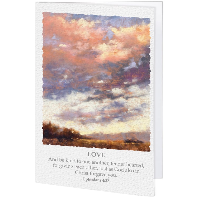 A greeting card from our Faith Collection displaying a calming landscape replicated from gorgeous original oil pastel artwork complemented by a "Love" sentiment and coordinating scripture of Ephesians 4:32. Our Love greeting card features textured paper on the outside as well as blank space inside to create a personalized message. An inspirational greeting card great for gifting to friends and family in everyday moments or special occasions. Proudly made in the USA.