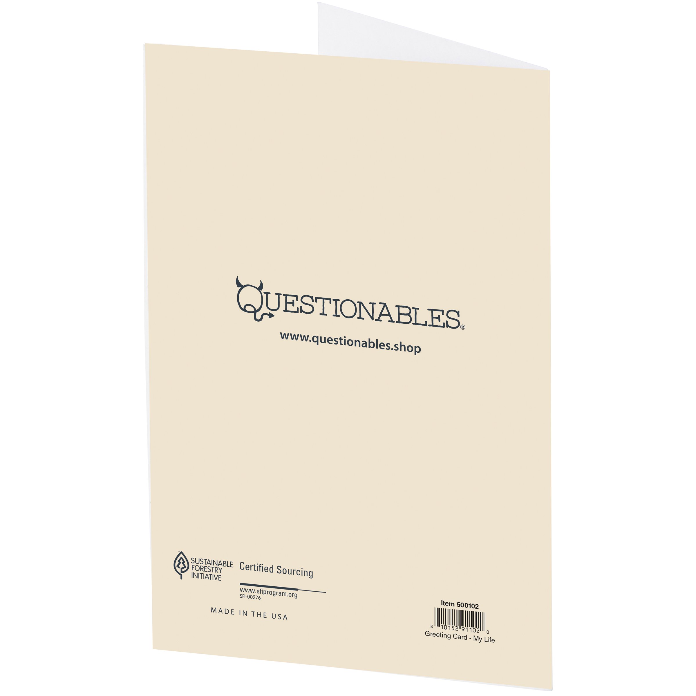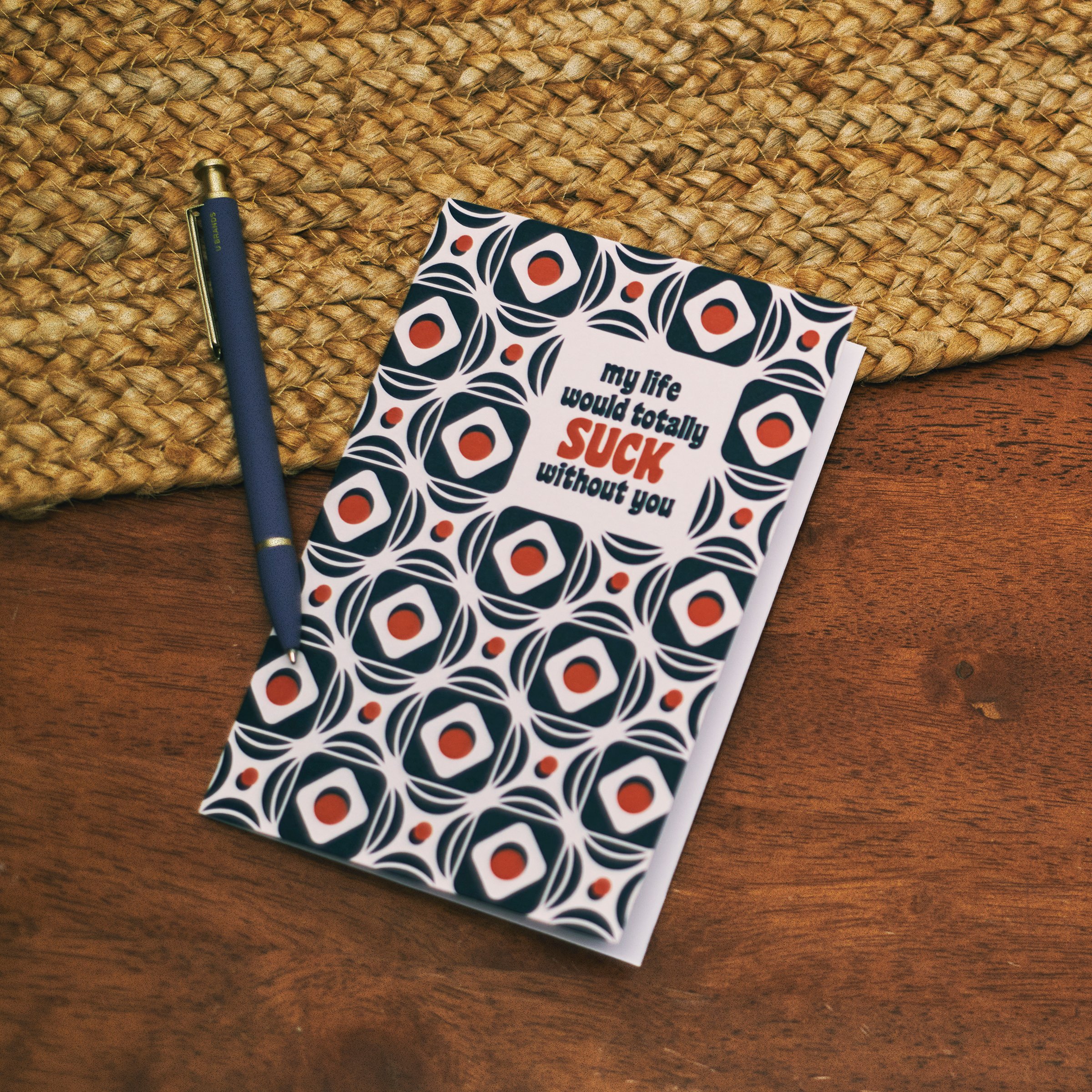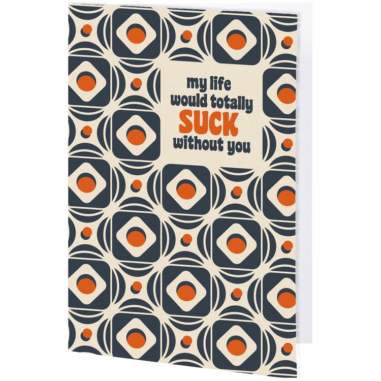 This relatable greeting card displays "My Life Would Totally Suck Without You" with a coordinating retro inspired pattern in a bold color palette. There's no need to wait for a special occasion or a specific holiday, this everyday greeting card is perfect for any moment a customer wants to present a personal message using the blank space inside. Questionables greeting cards include a craft paper envelope for a high-quality finishing touch. Proudly made in the USA. Our My Life greeting card calls back to a retro style while also calling out a modern mentality and offers a more relatable way to reach out to friends and family.