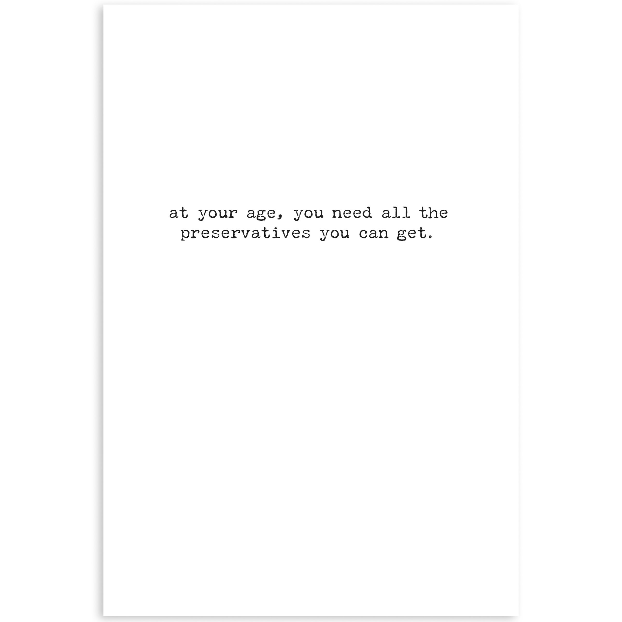 A greeting card from our Trash Talk By Annie Collection displaying a vintage black and white photograph complemented with a humorous age inspired sentiment. Greeting card features "Stay Away From Natural Foods..." sentiment on the outside and "At Your Age, You Need All The Preservatives You Can Get." sentiment on the inside with space to add a personalized message. Our Natural Foods greeting card is a hilarious gifting option for birthdays or everyday moments. Proudly made in the USA.