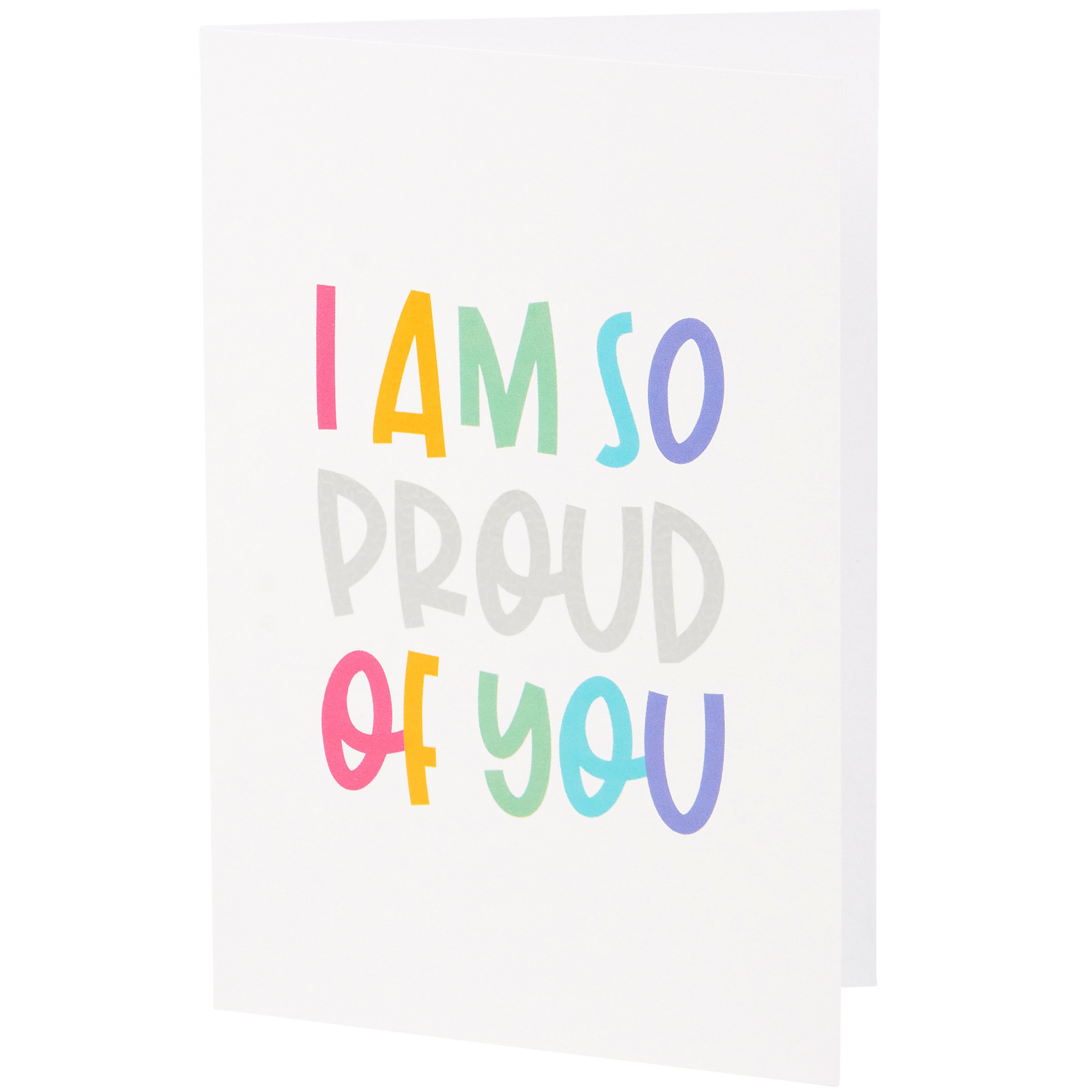 A cheerful greeting card from our Greeting Card Collection displaying a colorful sentiment with textured accents using metallic ink and silver foil to add shine to the design. The front of the card features "I Am So Proud Of You" sentiment with a blank space inside to create a personalized message. Each Proud Of You card includes a brown kraft paper envelope for the perfect finishing touch. An inspirational greeting card great for gifting in everyday moments or special occasions. Proudly made in the USA.
