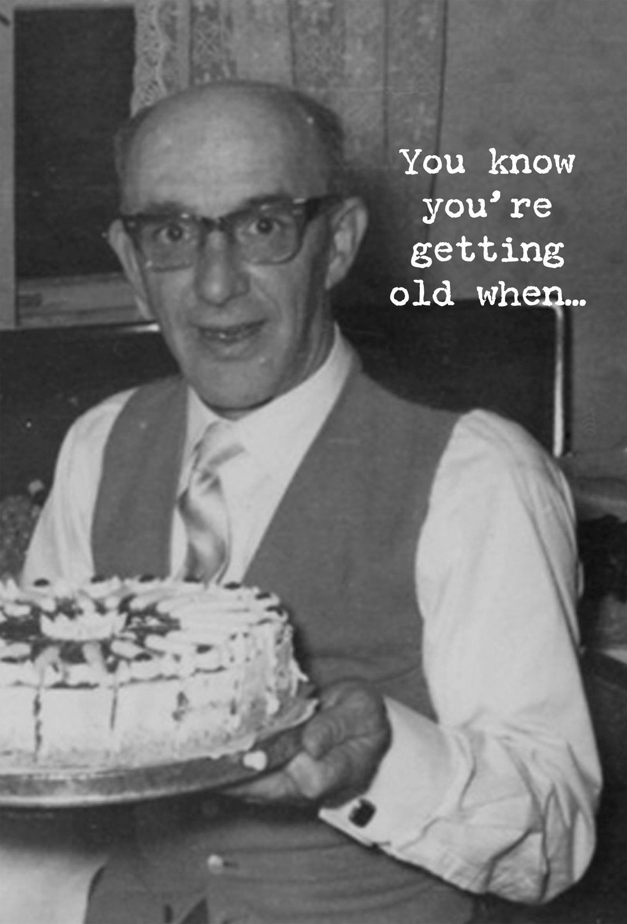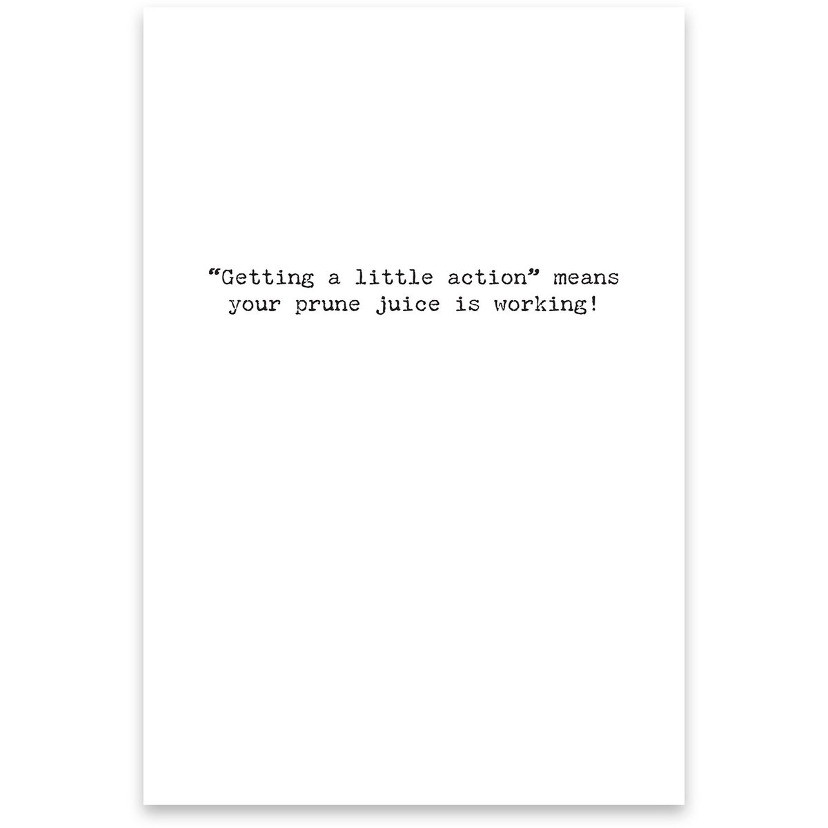 A humorous greeting card lending a vintage photograph to coordinate with its outside "You Know You're Getting Old When..." sentiment and inside "'Getting A Little Action' Means Your Prune Juice Is Working" sentiment. Made in the USA.