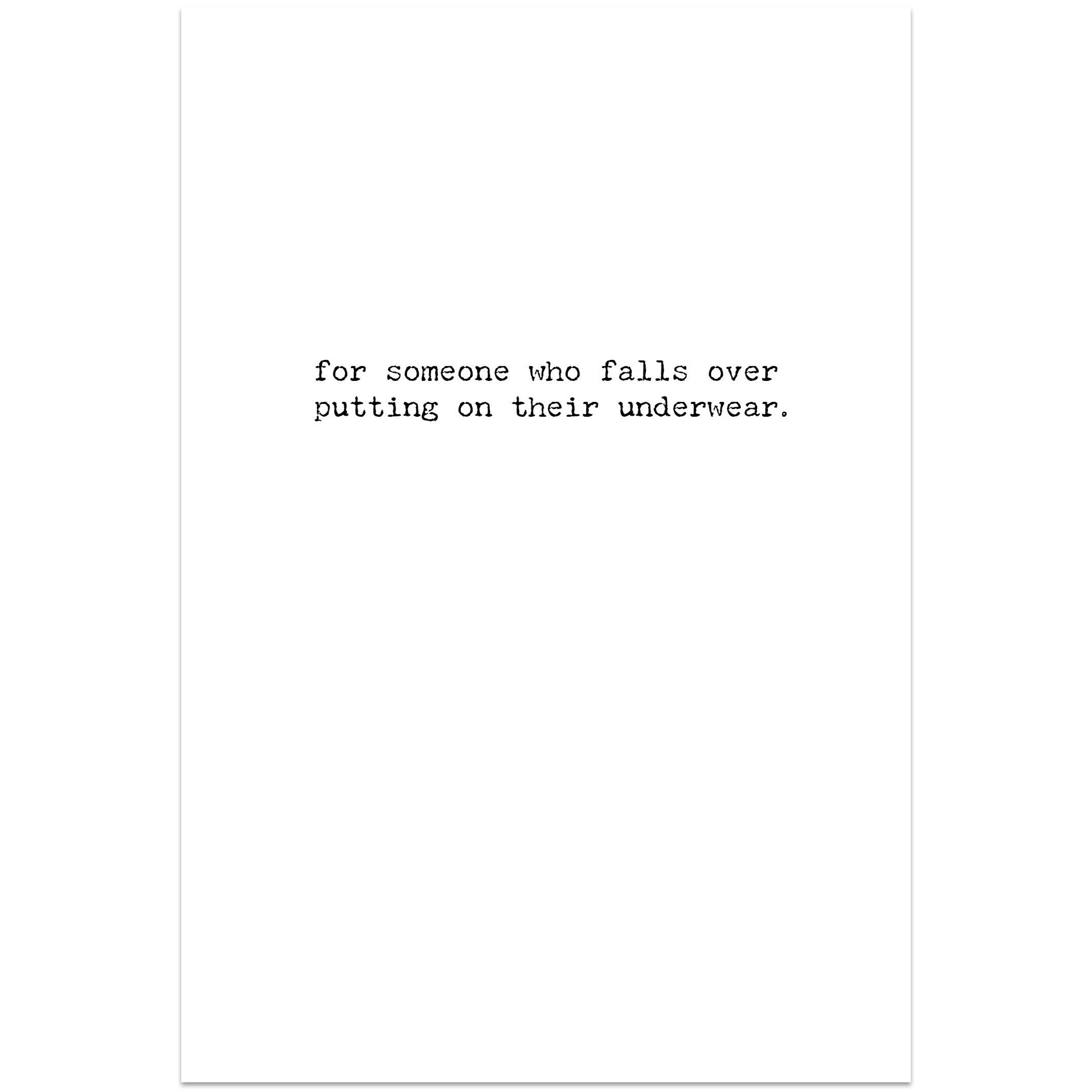 A humorous greeting card from our Trash Talk By Annie Collection displaying a vintage photograph with complementing sentiment. Card features "I Talk An Awful Lot Of Smack…" sentiment on the outside and "For Someone Who Falls Over Putting On Their Underwear." sentiment on the inside with space to add a personalized message. Our Talking Smack greeting card is a hilarious gifting option for everyday moments. Proudly made in the USA.
