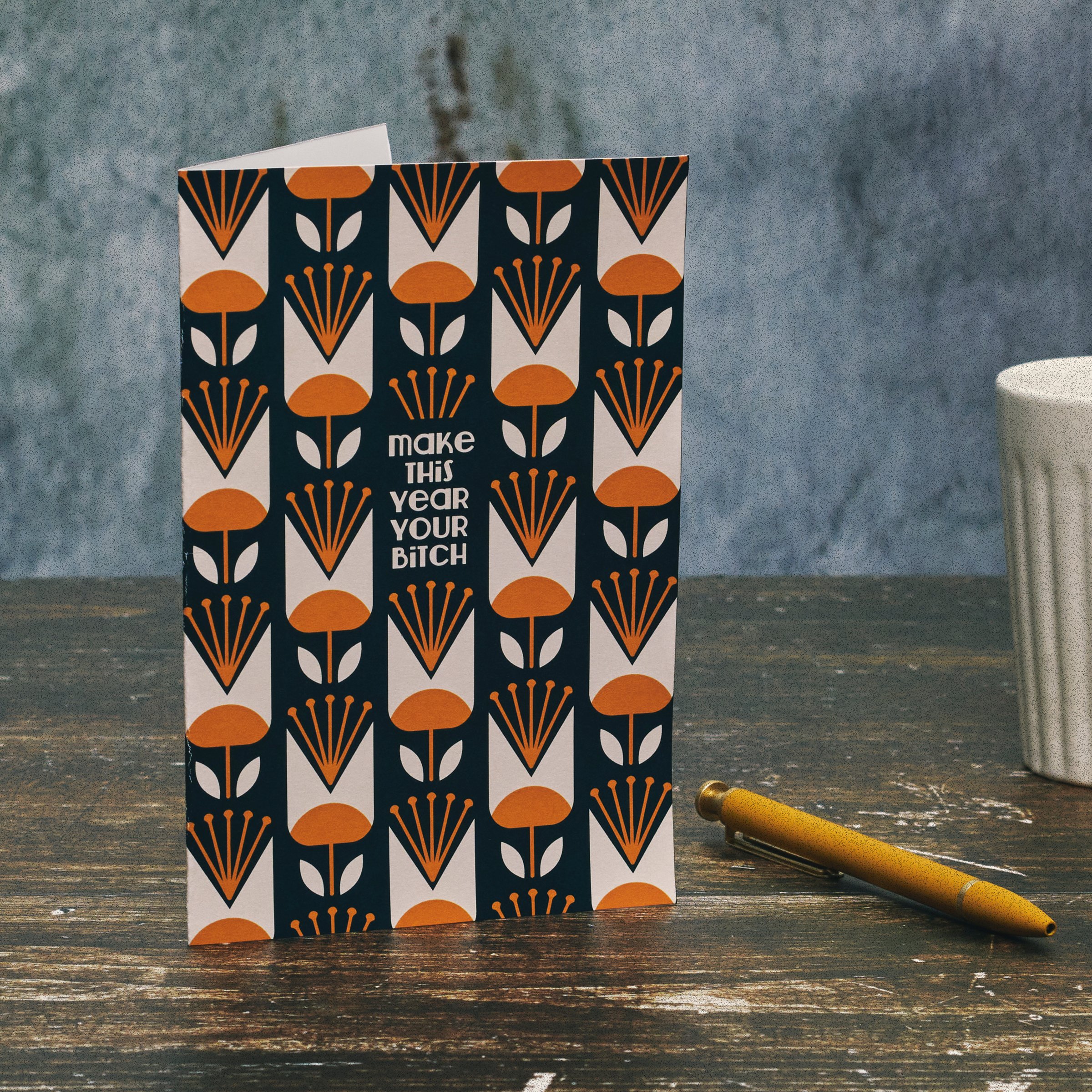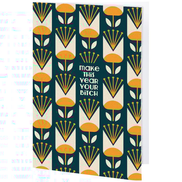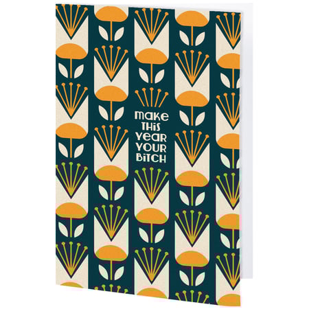 This sassy greeting card displays "Make This Year Your Bitch" with a coordinating stylish floral pattern in a bold color palette. For when a customer is looking for a more relatable way to say happy birthday, this greeting card is perfect for presenting a personal birthday message using the blank space inside. Questionables greeting cards include a craft paper envelope for a high-quality finishing touch. Proudly made in the USA. Our This Year greeting card offers a sassy way to wish like-minded friends or family a happy birthday and lets them know that everyday life can be hard, but they got this.