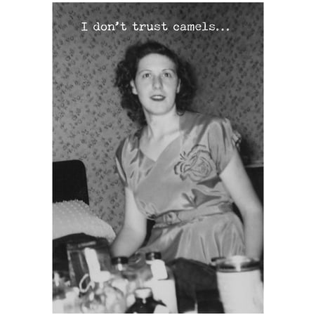 A greeting card from our Trash Talk By Annie Collection displaying a vintage black and white photograph complemented with a humorous alcohol-themed sentiment. Greeting card features "I Don't Trust Camels..." sentiment on the outside and "Or Anything Else That Can Go A Week Without A Drink." sentiment on the inside with space to add a personalized message. Our Trust Camels greeting card is a hilarious gifting option for everyday moments. Proudly made in the USA.