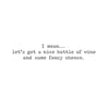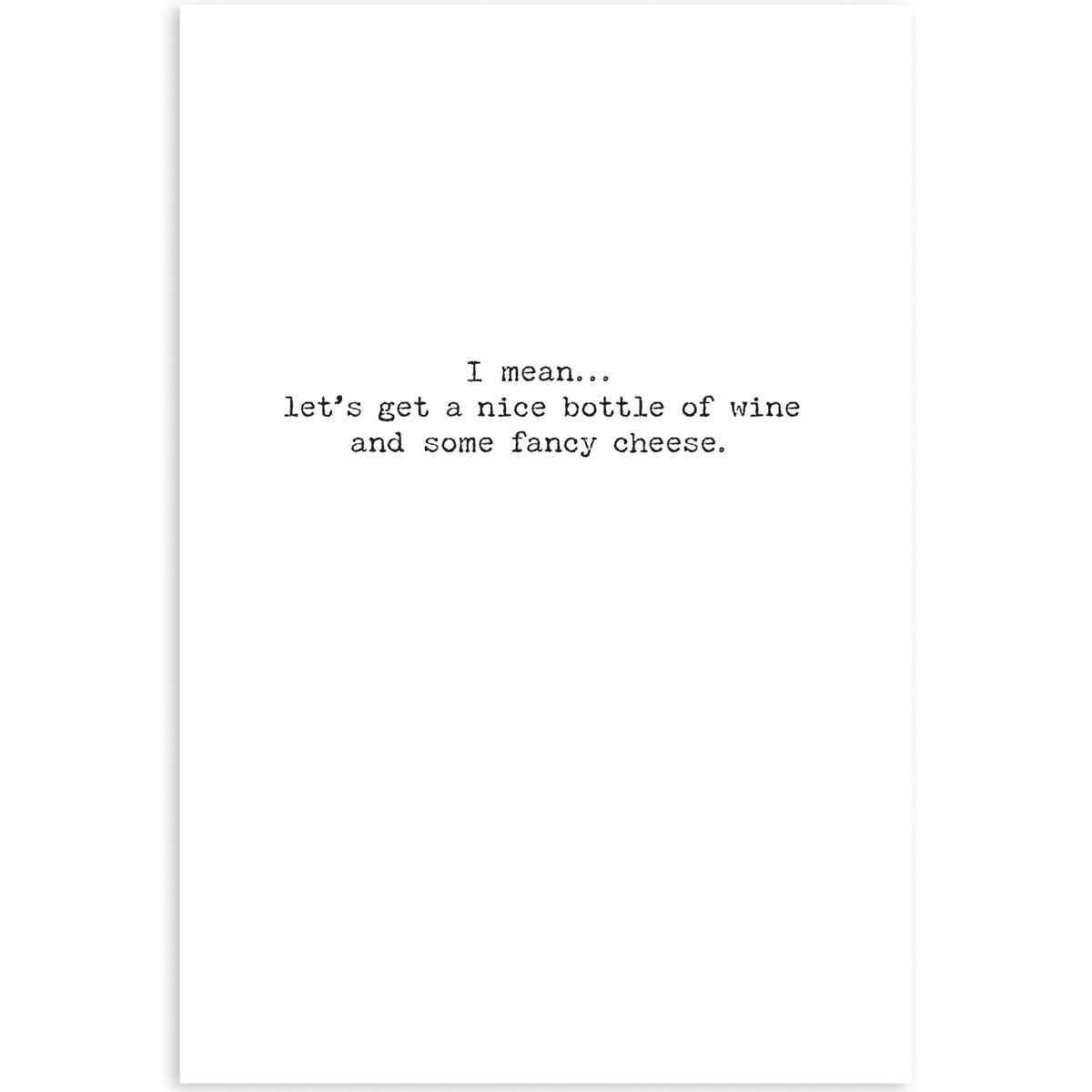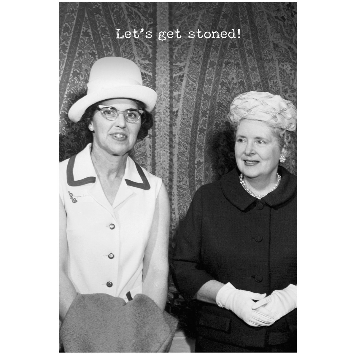 A greeting card from our Trash Talk By Annie Collection displaying a vintage black and white photograph complemented with a humorous sentiment. Greeting card features "Let's Get Stoned!" sentiment on the outside and "I Mean... Let's Get A Nice Bottle Of Wine And Some Fancy Cheese." sentiment on the inside with space to add a personalized message. Our Wine & Cheese greeting card is a hilarious gifting option for everyday moments. Proudly made in the USA.