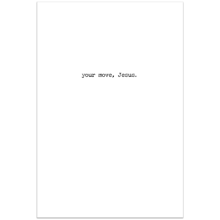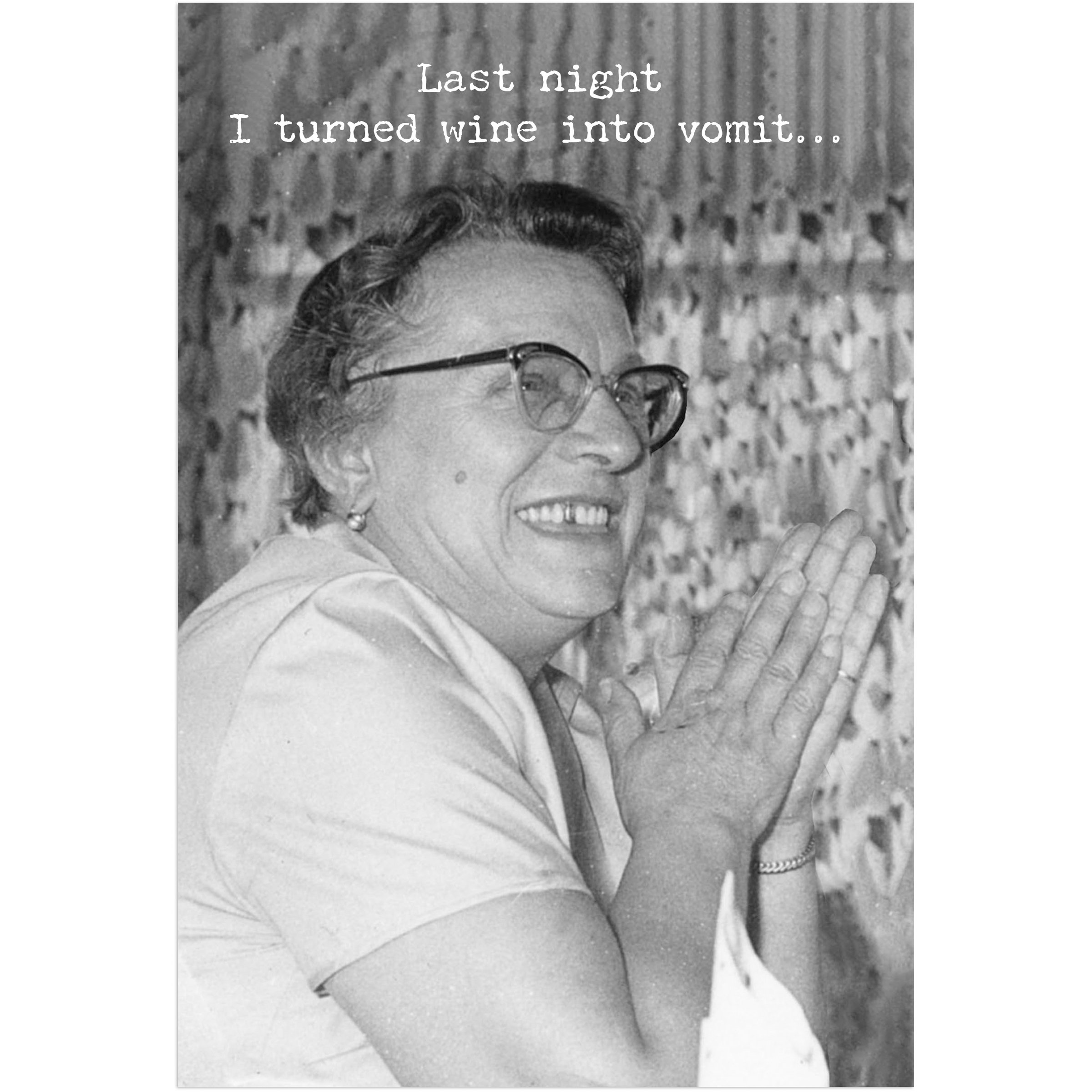 A humorous greeting card from our Trash Talk By Annie Collection displaying a vintage photograph with complementing sentiment. Card features "Last Night I Turned Wine Into Vomit…" sentiment on the outside and "Your Move, Jesus." sentiment on the inside with space to add a personalized message. Our Turned Wine greeting card is a hilarious gifting option for everyday moments. Proudly made in the USA.