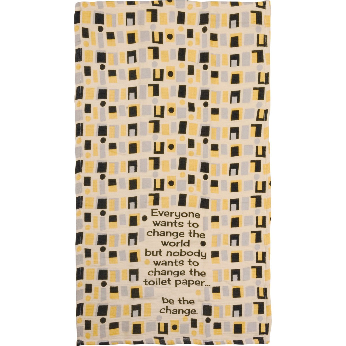A cotton hand towel featuring an "Everyone Wants To Change The World But Nobody Wants To Change The Toilet Paper…Be The Change." sentiment with an all-over retro-inspired pattern. Includes absorbent terry bottom layer. Machine-washable.