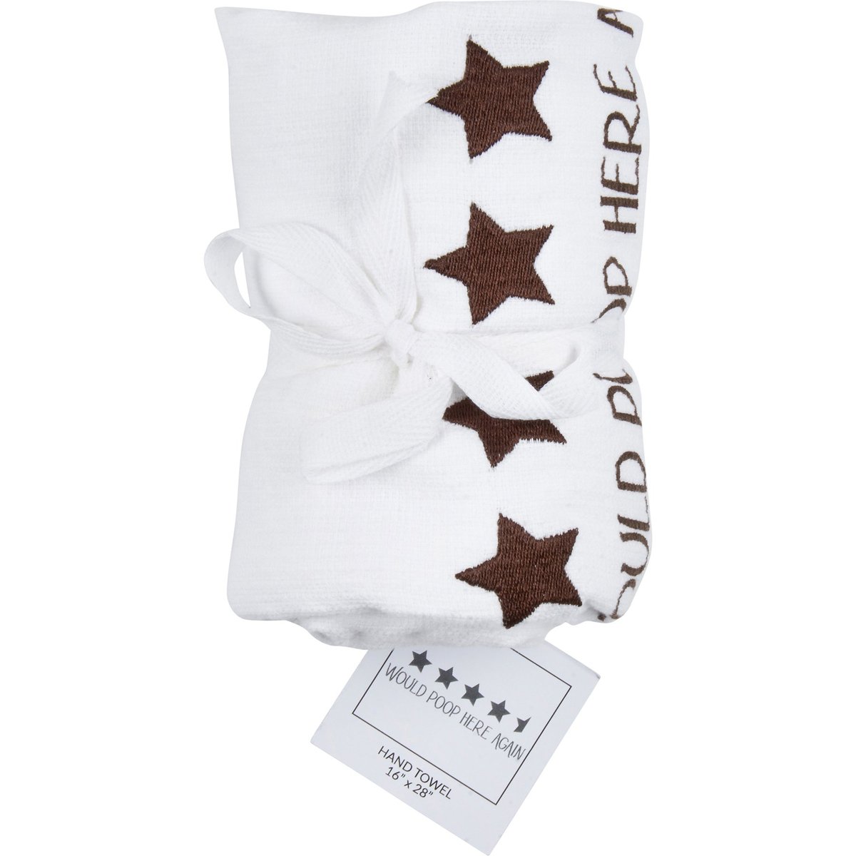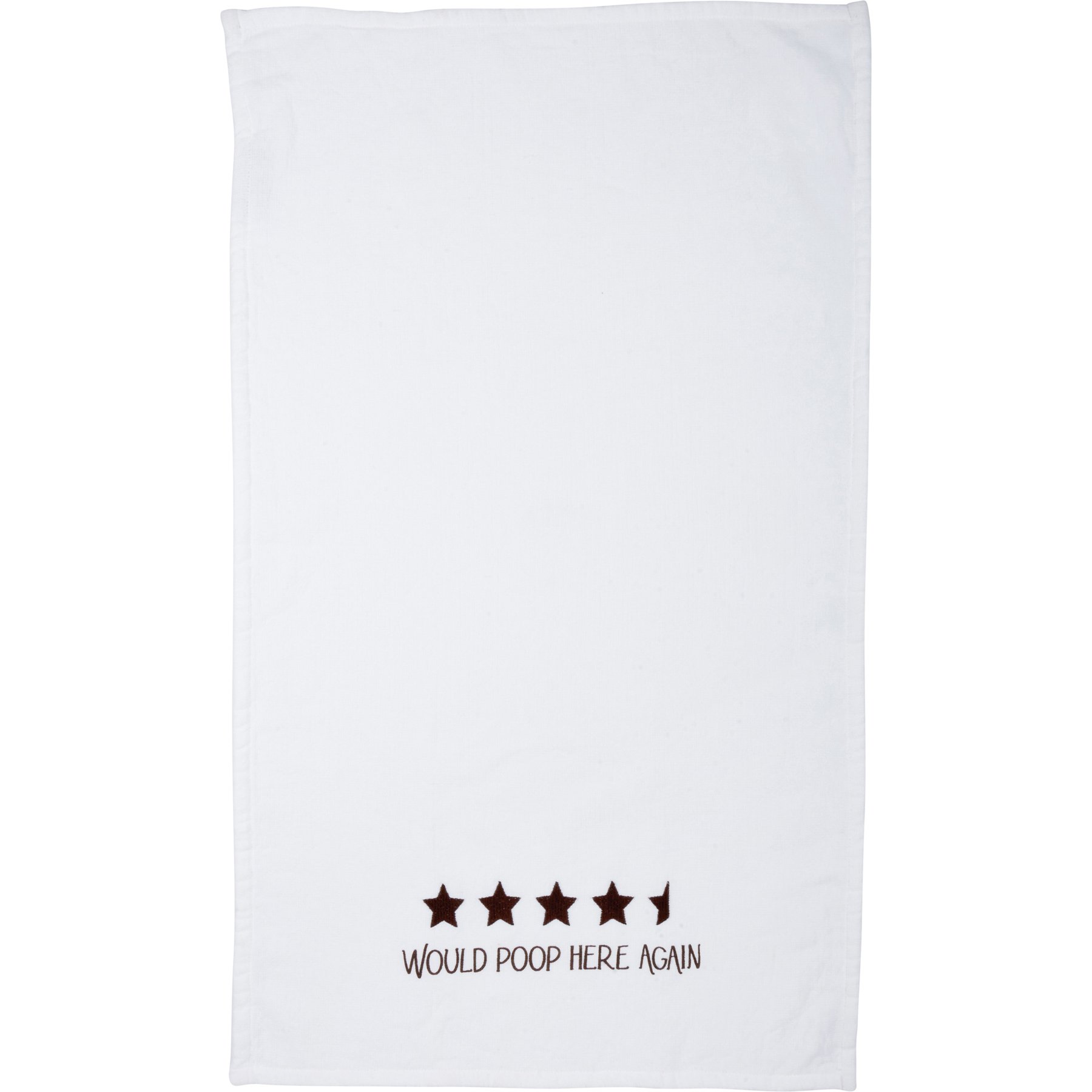A white cotton hand towel from our Room By Room Collection displaying a four and half star review design and humorous sentiment that reads "Would Poop Here Again" fully embroidered for textured detail. Towel features absorbent terrycloth layer on the back with cotton tape loop for easy hanging. Our Would Poop Here Again hand towel comes rolled and wrapped with cotton tape including hangtag displaying full design. Machine-washable for convenient cleaning. A fun everyday home accent perfect for any bathroom.