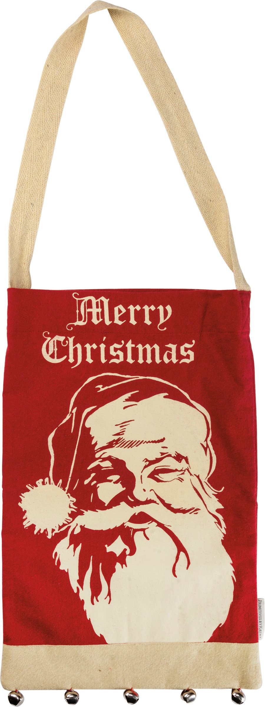 A vintage-inspired hanging cotton bag featuring a "Merry Christmas" sentiment, Santa design, and bottom bell trim details. Contains a top fabric loop for easy hanging.