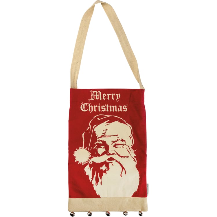 A vintage-inspired hanging cotton bag featuring a "Merry Christmas" sentiment, Santa design, and bottom bell trim details. Contains a top fabric loop for easy hanging.