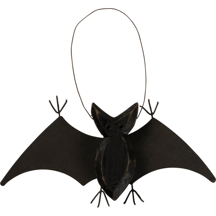 A wooden hanging bat decor piece from our Halloween Collection features a bat design with metal wings and a wire loop for easy hanging. Our Hanging Bat complements well with coordinating design pieces for a spooky collection.