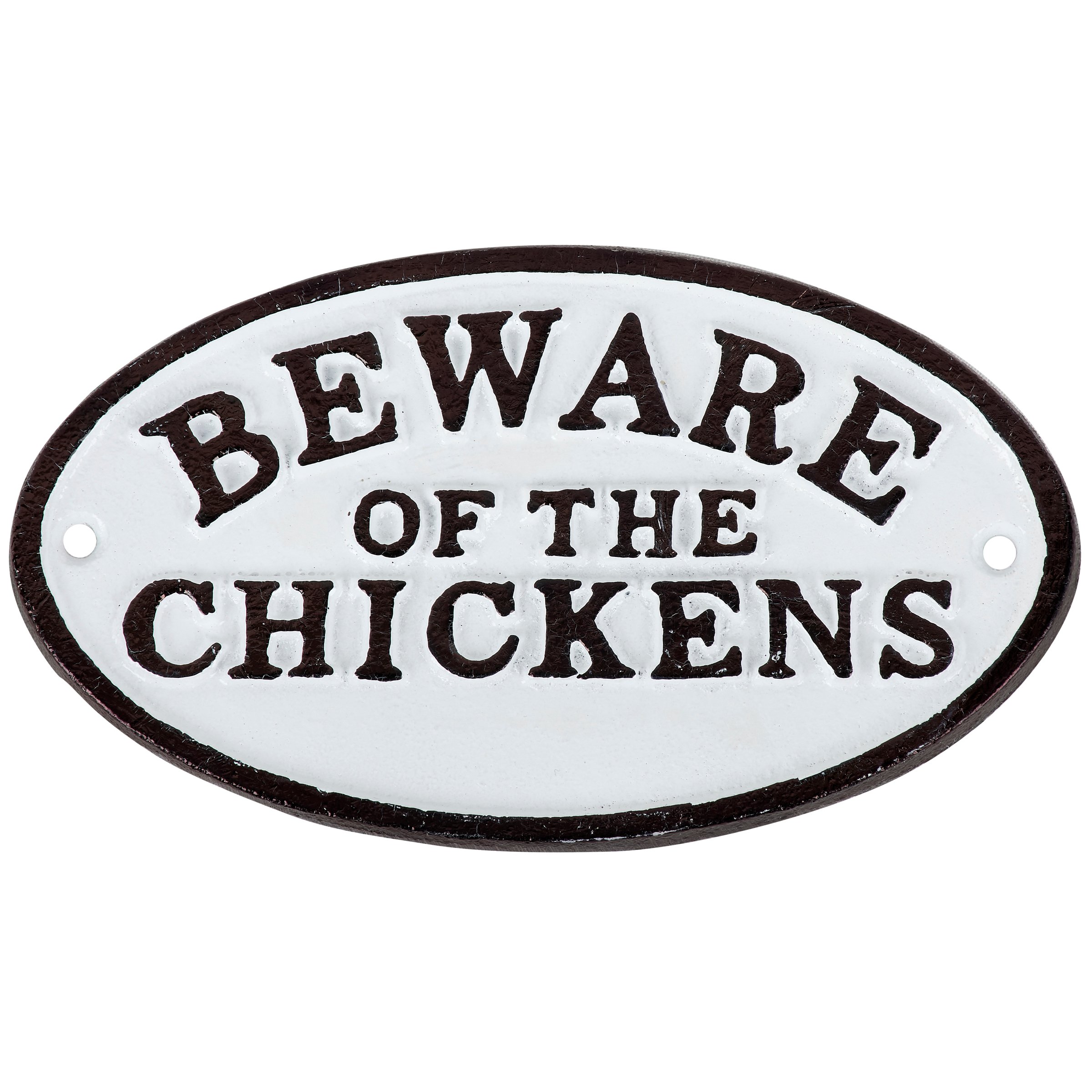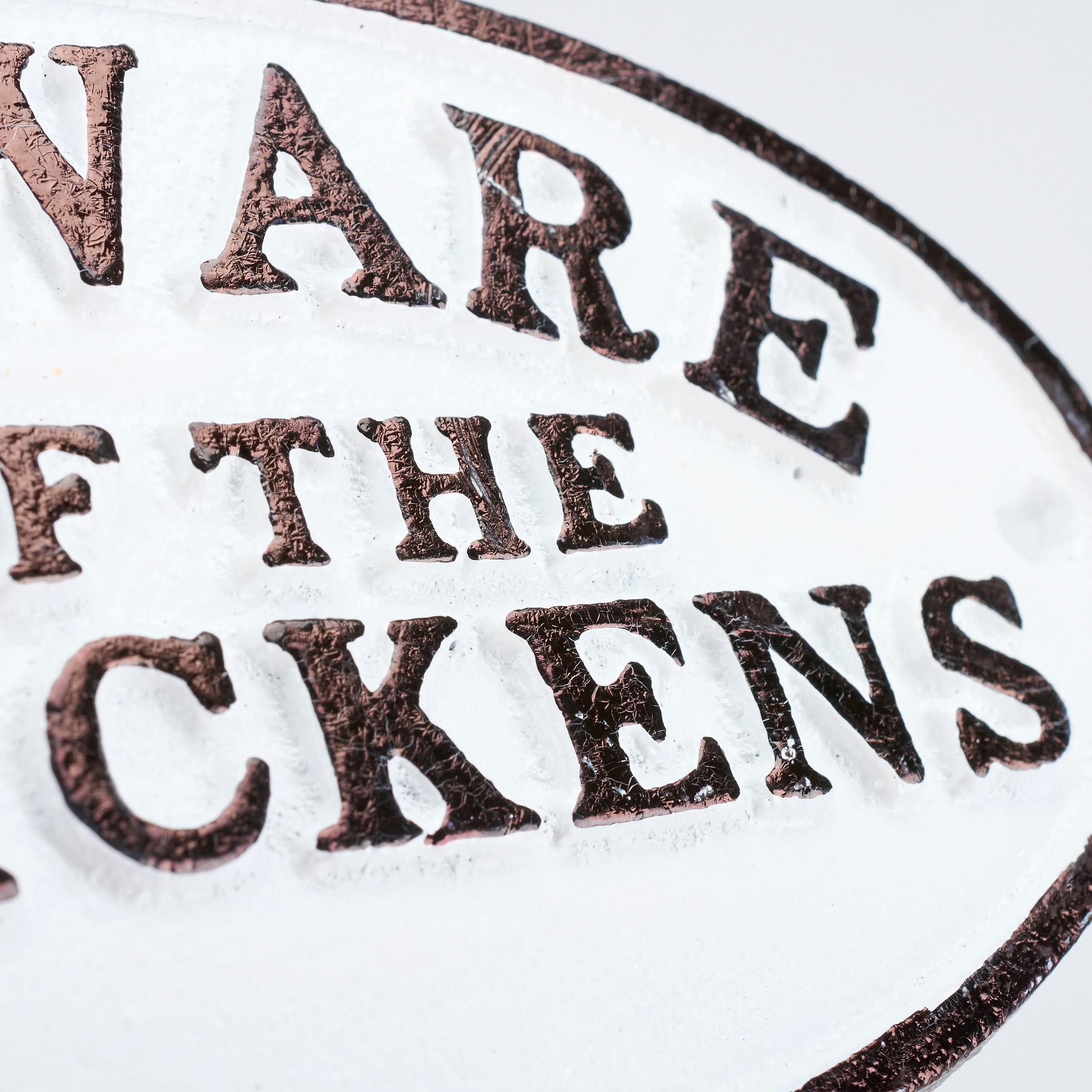 A metal wall décor piece from our Farmhouse Collection featuring a sturdy painted metal design displaying a rustic farm inspired sentiment that reads "Beware Of The Chickens." Design features embossed details for added dimension. Our Beware Of The Chickens wall décor is easy to hang against wall using the pre-drilled holes on each side. A rustic farm themed home accent perfect for everyday display.