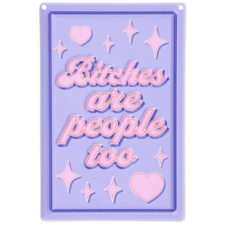 Easily add personality to any space with designs that "pop" off the wall in more ways than one. This ready to hang metal décor piece features a sassy eye-catching design full of self-expression with embossed details for added dimension. Spread awareness with this cute retro inspired design of a sassy sentiment that reads "Bitches Are People Too." Our Bitches Are People Too metal wall décor is easy to hang against wall using the included mounting hardware and pre-drilled holes in each corner. Sassy wall decor that is great for gifting!