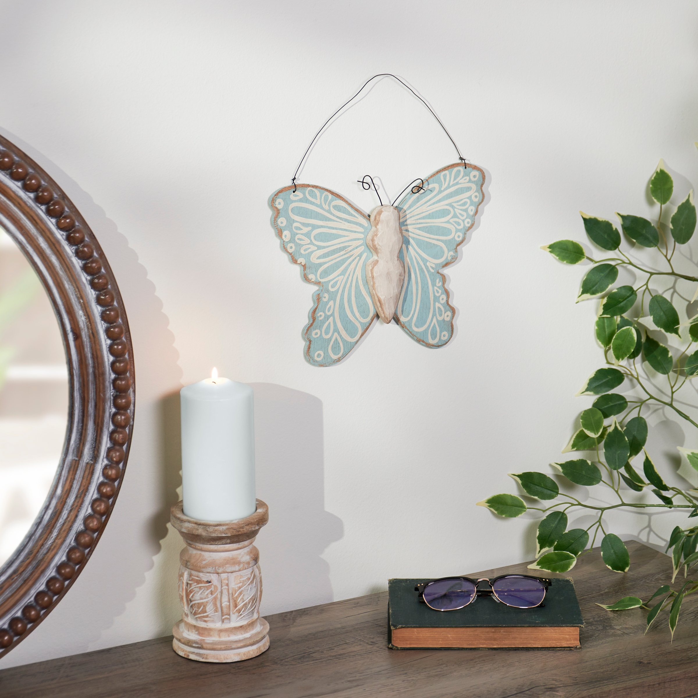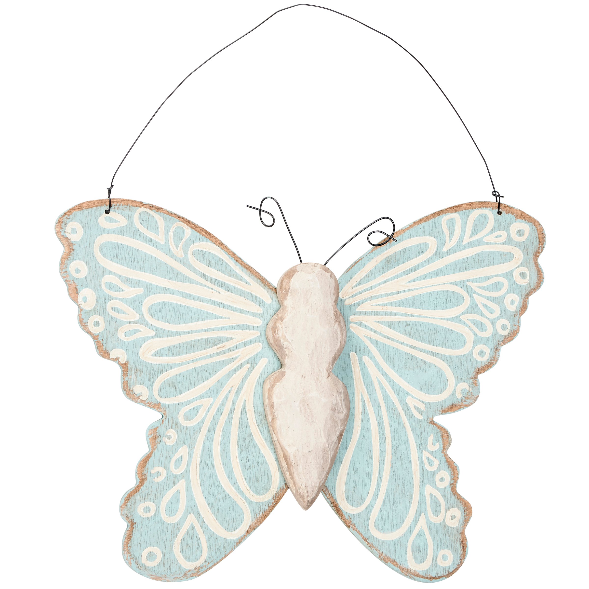 A hanging décor piece from our Garden Collection displaying a large butterfly design made from carved wood pieces. Butterfly décor features painted details and wire accents for a unique handmade appearance. Hanging décor features wire hanger attached to each wing and coordinating blue color on the back. Our Butterfly hanging décor is easy to hang via wire hanger. A charming everyday home accent perfect for adding character to any room.