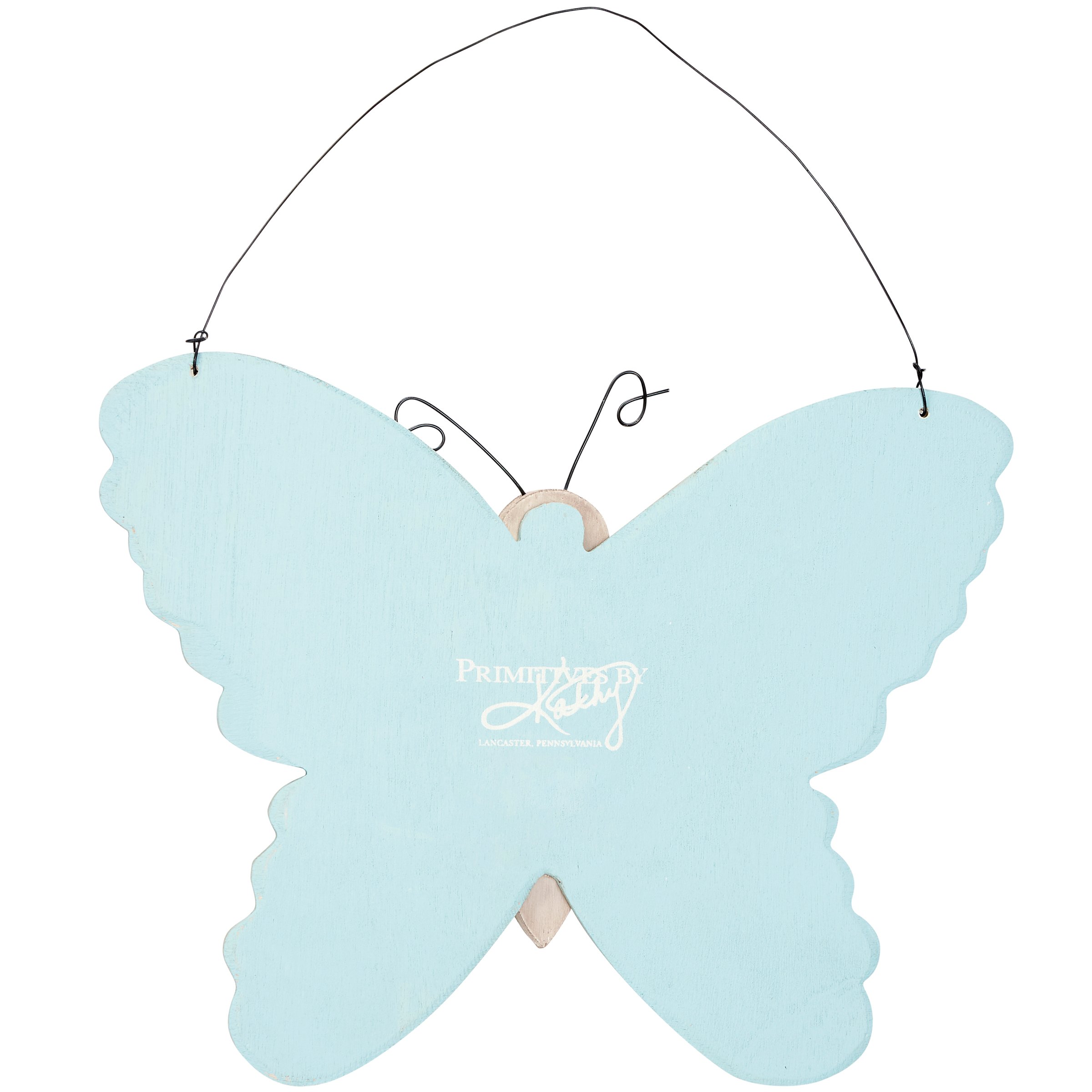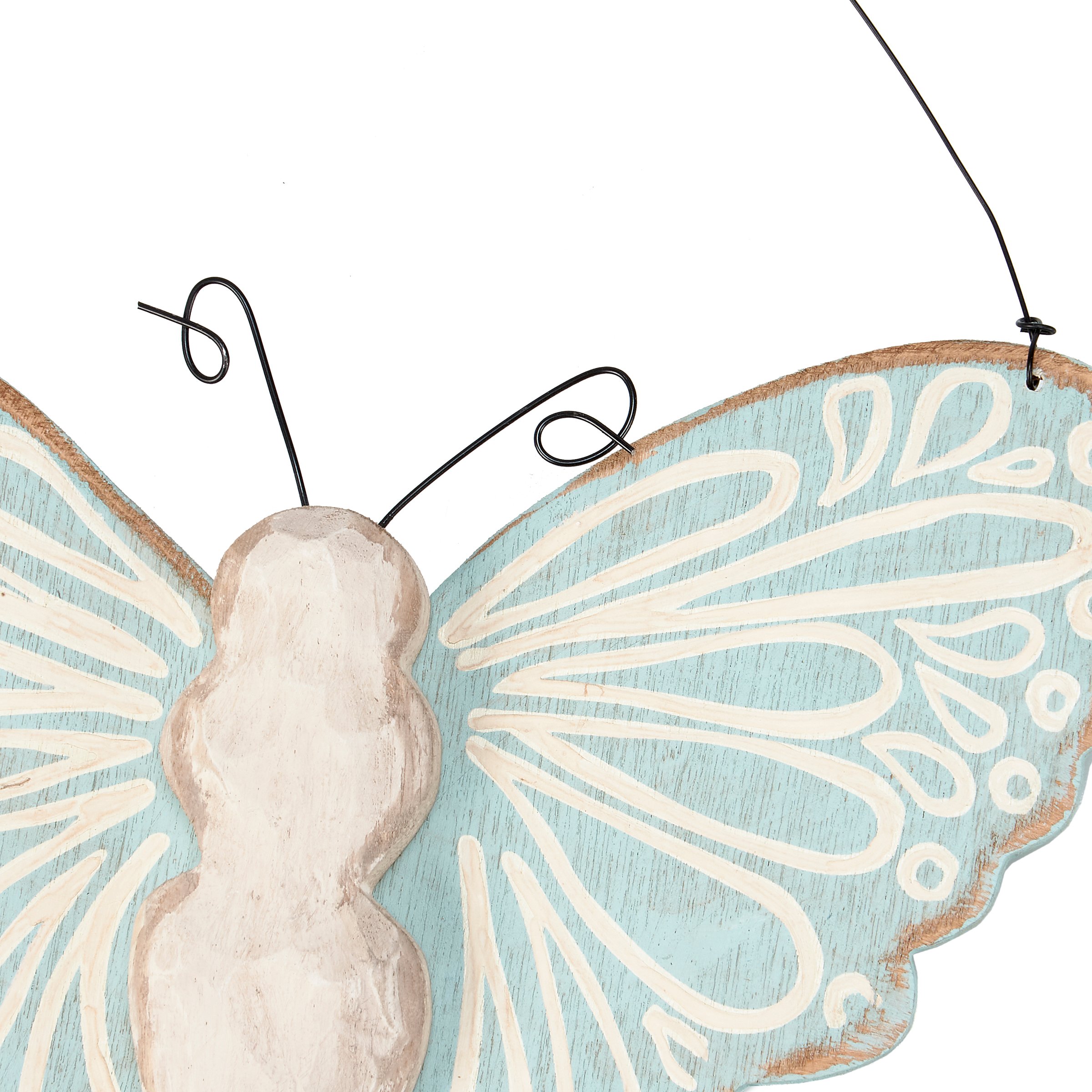 A hanging décor piece from our Garden Collection displaying a large butterfly design made from carved wood pieces. Butterfly décor features painted details and wire accents for a unique handmade appearance. Hanging décor features wire hanger attached to each wing and coordinating blue color on the back. Our Butterfly hanging décor is easy to hang via wire hanger. A charming everyday home accent perfect for adding character to any room.